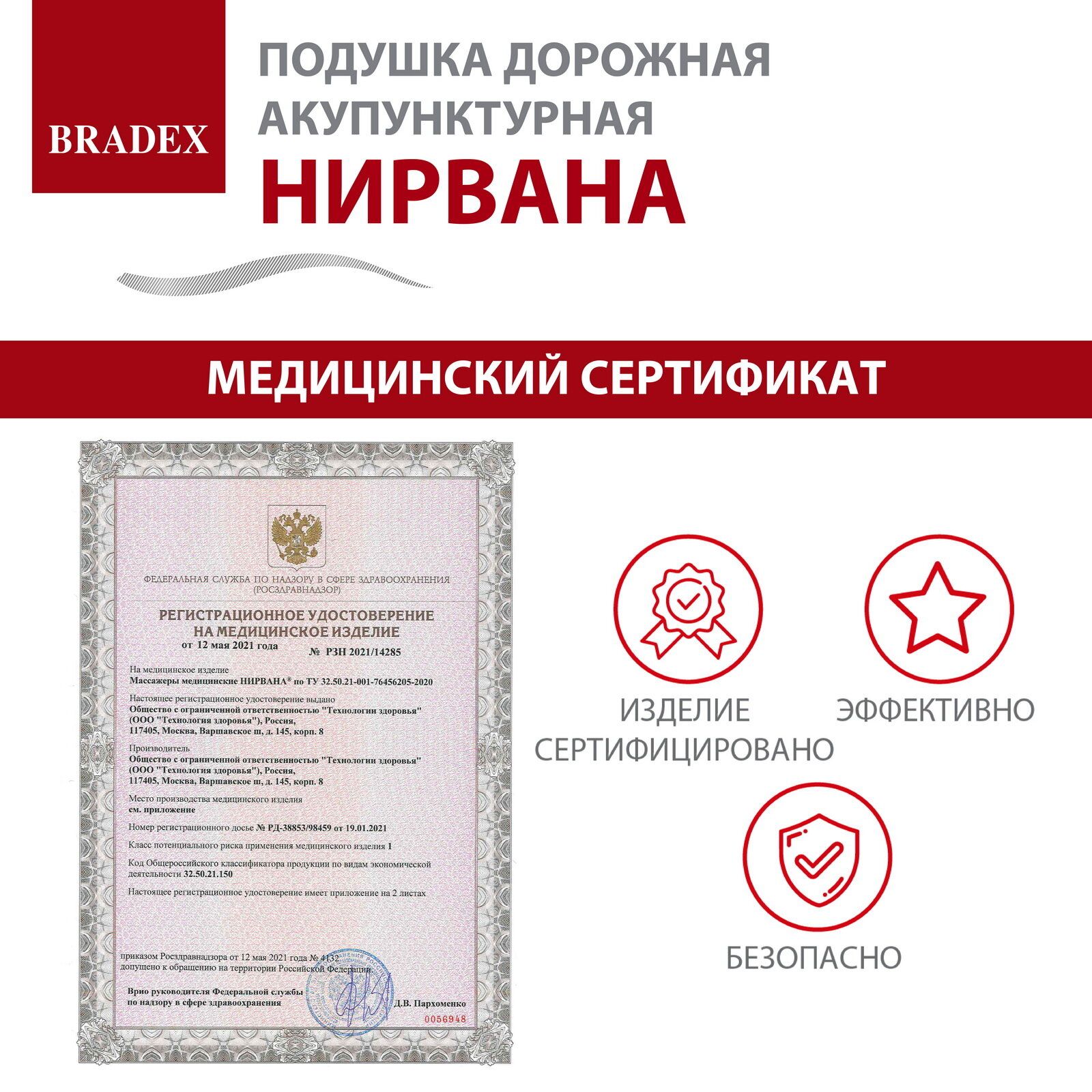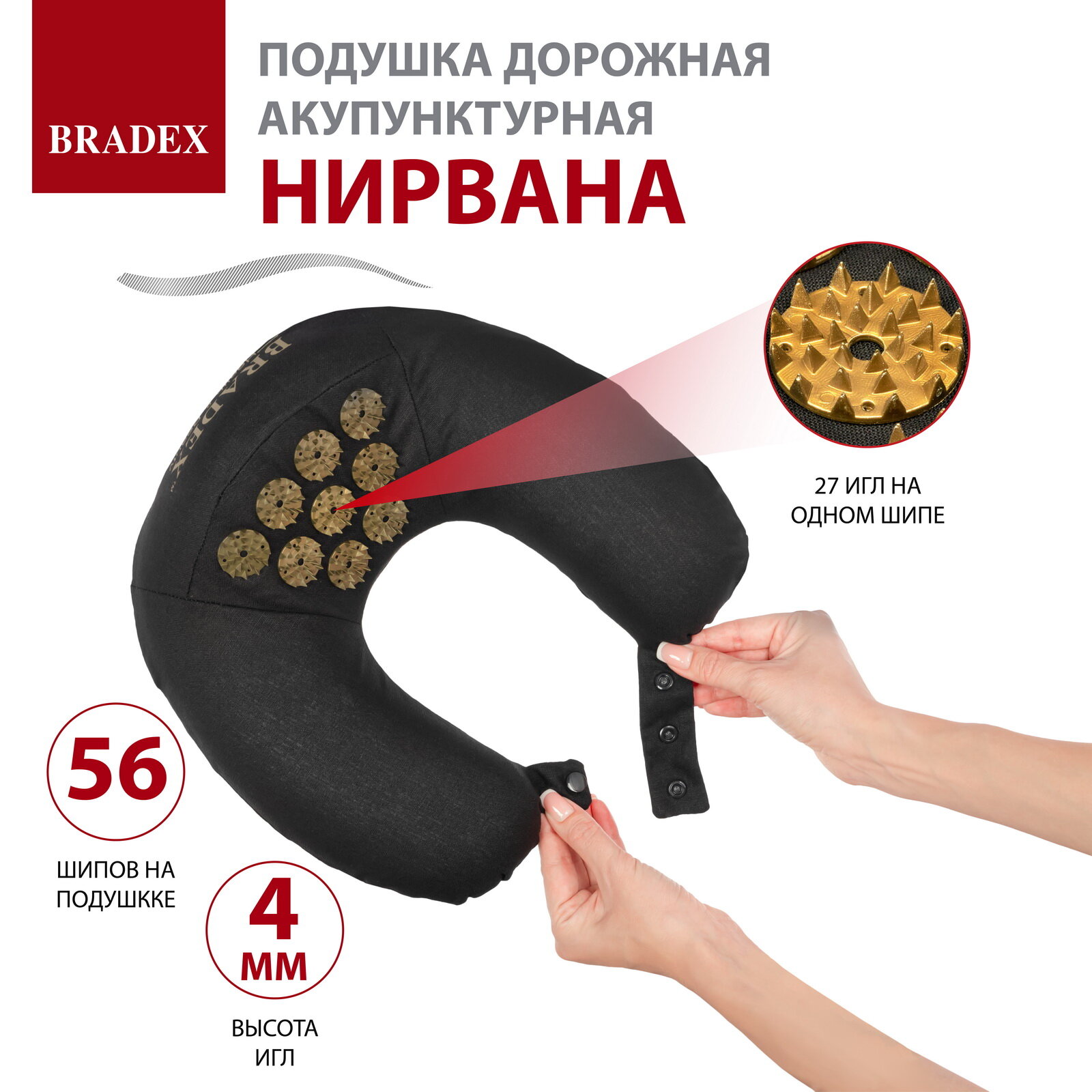 В основе серии товаров НИРВАНА® лежит древнекитайский метод игольчатого массажа для воздействия на активные точки тела.Подушка дорожная акупунктурная НИРВАНА® – идеальное решение для путешествий, релаксации в офисе, дома и в машине. Поддерживая естественное положение шеи, подушка осуществляет полноценный акупунктурный массаж и прекрасно снимает напряжение.Акупунктурная подушка НИРВАНА® – прекрасный подарок для всех тех, кто не имеет интенсивных физических нагрузок, проводит много времени на работе и дома, находясь в положении сидя, ведет малоподвижный образ жизни.Ежедневные 15-минутное использование подушки позволит снять перенапряжение в конце дня и ощутить прилив новых сил.Также акупунктурный массаж рекомендуется в борьбе с бессонницей, стрессом и лишним весом.Преимущества:- медицинское изделие высокой эффективности;- подходит для локального воздействия на акупунктурные точки шеи;- удобные ремешки для фиксации подушки;- натуральные материалы и современный дизайн;- улучшает кровообращение и лимфодренаж;- способствует устранению мышечного спазма, гипертонуса и зажимов мышц;- помогает справиться с усталостью, бессонницей и восстановить работоспособность.