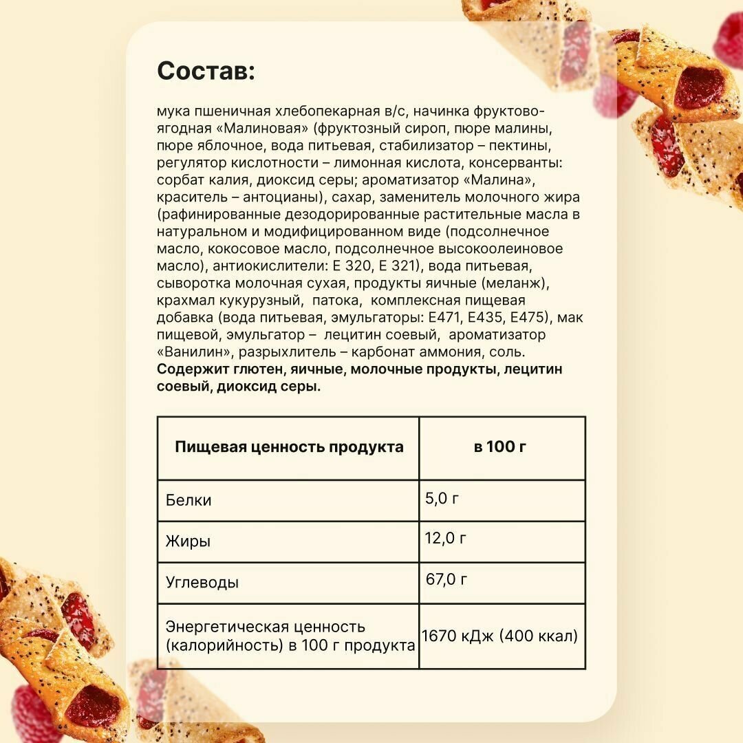 Сдобное печенье от бренда Акульчев привлекает к себе внимание необычной формой. Оно выполнено в виде миниатюрного конвертика, наполненного натуральным малиновым джемом. Как у детей, так и взрослых женщин и мужчин, появляется непреодолимое желание его попробовать. Сладости непременно навеют воспоминания о детстве и поднимут настроение. При их изготовлении использовались исключительно свежие, качественные ингредиенты. Печеньки невероятно мягкие и нежные, способны удовлетворить изысканные женские и мужские вкусы, но особый восторг вызовут у маленького ребенка. Вкусняшки идеально дополняют детское и правильное питание, подойдут для домашнего завтрака и перекуса в дороге. Кондитерские изделия поставляются в удобной упаковке. Набор печенья находится в красивой коробочке. Классическая выпечка - отличный гостинец и неординарный подарок на праздники. Эти вкусности понравятся каждому человеку и по достоинству будут оценены любителями классики. Ведь продукция обладает непревзойденным вкусом и изысканным ароматом, тщательно подобранным составом.