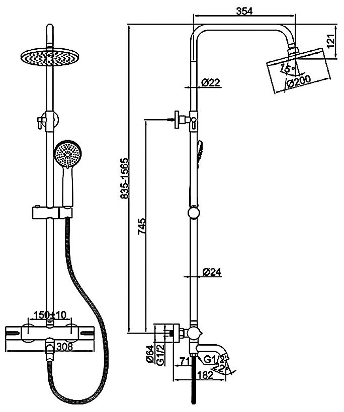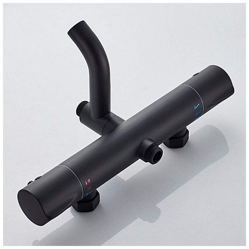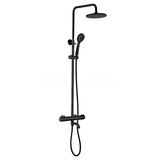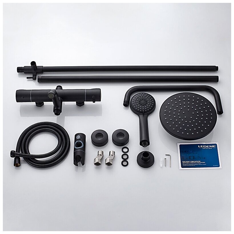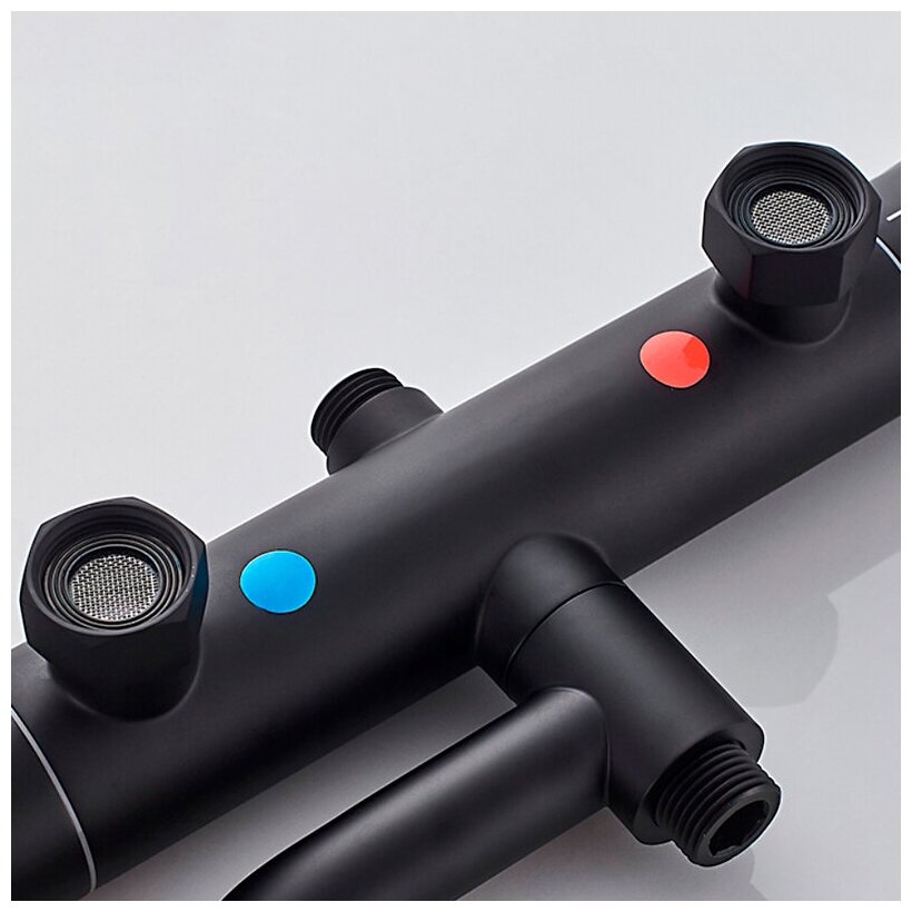Душевая стойка. Цвет-черный. Поверхность-матовая. С термостатом. Материал-цинк. Излив-поворотный. Длина излива-11.1см. Длина шланга-150см. Количество режимов лейки-3. Подводка-жесткая. Подключение горячей воды-слева. Размер верхнего душа-20см. Тропический душ. Комплектация: смеситель, душевая стойка, верхний душ, лейка, шланг, держатель, отражатели, эксцентрики
