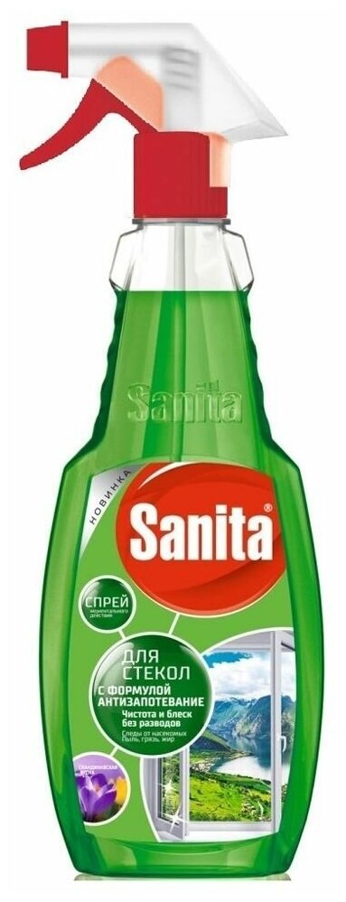Спрей Sanita для чистки стекол 500мл со свежим ароматом Скандинавская весна помогает быстро и качественно справиться с мытьем окон.