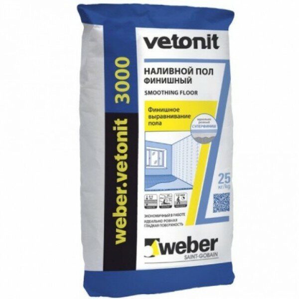 weber.vetonit 3000 - финишный наливной пол на цементной основе. Супертонкий, экономичный, самовыравнивающийся, износостойкий. Смесь используется как для сухих внутренних помещений, так и для помещений с повышенной влажностью, а также в качестве тонкослойного финишного покрытия в системе Теплый пол .