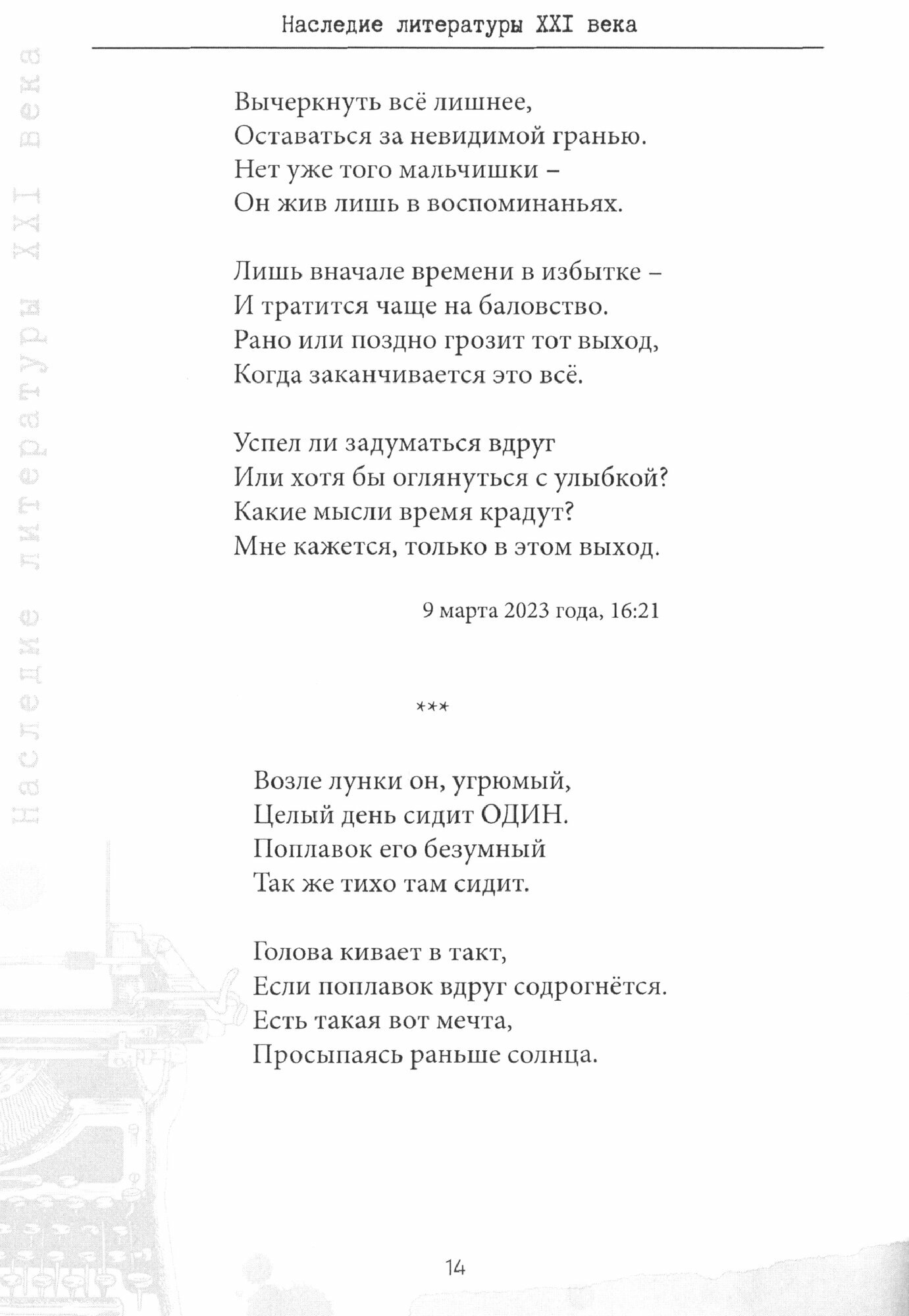 Загляните в душу современной литературы с нашим новым сборником "Наследие литературы XXI века". Этот уникальный альманах представляет собой великолепное слияние прозы и поэзии, наполненное разнообразием мыслей, эмоций и впечатлений. "Наследие" собрало на своих страницах выдающиеся произведения современных авторов, чьи таланты и вдохновение способны перенести нас в новые миры и заставить нас увидеть привычное под другим углом. Погрузитесь в этот сборник, взгляните на современную литературу глазами талантливых авторов. Откройте для себя новые миры и переживания, дайте своим мыслям и эмоциям возможность разгуляться на этих страницах.