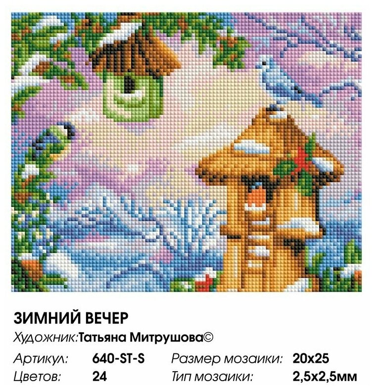 | Комплектация | Основа картины - холст с нанесенной схемой на подрамнике; Комплект квадратных камней с огранкой 2,5* 2,5 мм.; Пластмассовый лоток с ячейками; Пинцет металлический; Крепления для подвеса на стену; Дополнительный тюбик клея; Листовка-ключ к схеме; Складной лоток из картона для хранения пакетиков с камнями; Листовка о художнике |