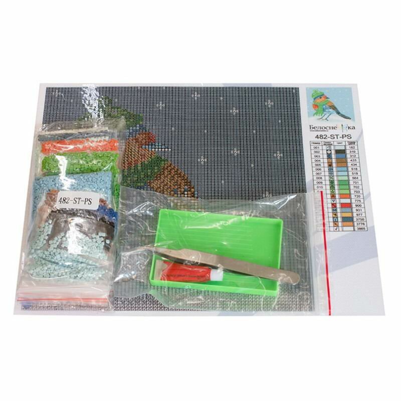 | Комплектация | Основа картины - холст с нанесенной схемой и клеевым покрытием; Комплект квадратных камней с огранкой 2,5* 2,5 мм.; Пластмассовый лоток с ячейками; Пинцет металлический; Крепления для подвеса на стену; Дополнительный тюбик клея; Листовка-ключ к схеме |