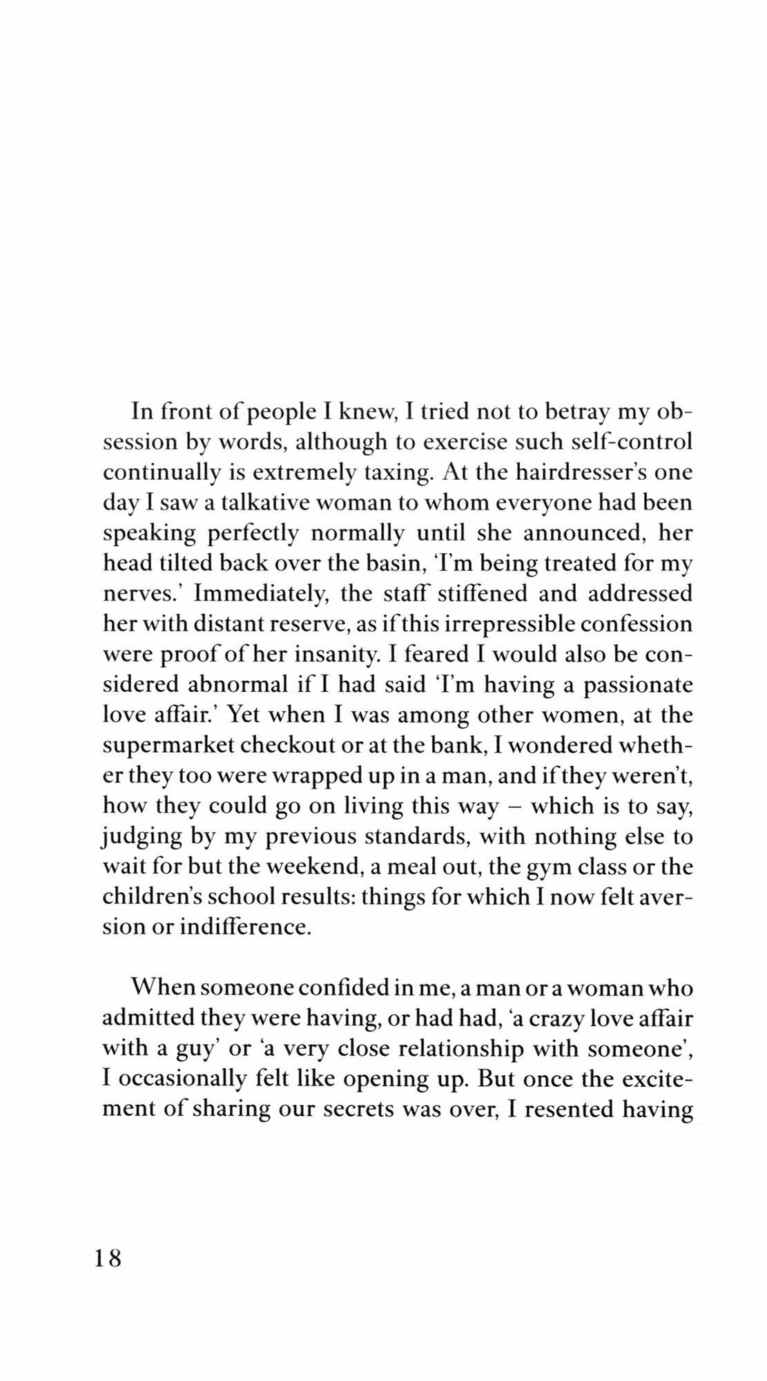 In her spare, stark style, Annie Ernaux documents the desires and indignities of a human heart ensnared in an all-consuming passion. Blurring the line between fact and fiction, she attempts to plot the emotional and physical course of her two-year relationship with a married man where every word, event, and person either provides a connection with her beloved or is subject to her cold indifference. With courage and exactitude, Ernaux seeks the truth behind an existence lived, for a time, entirely for someone else.