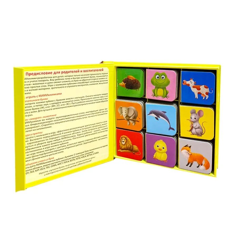 Набор книжек-кубиков Мими-книжки «Учусь говорить. Буквы, Слоги, Слова» предназначен для малышей, только начинающих познавать мир и произносить первые слова. Внутри вы найдёте 9 книжек-кубиков с буквами русского алфавита, словами и картинками животных.