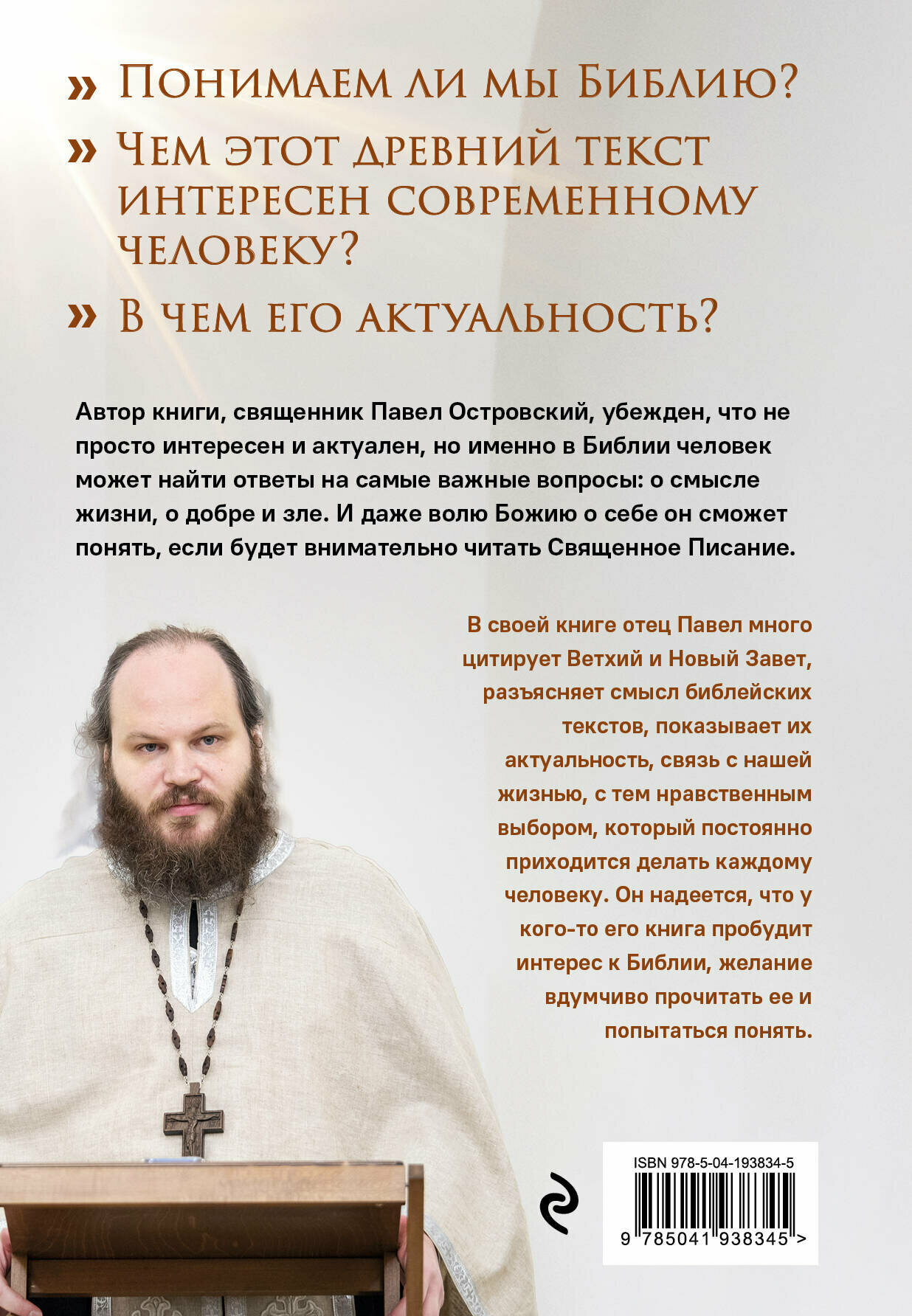 Понимаем ли мы Библию? Чем этот древний текст интересен современному человеку? В чем его актуальность? Автор книги, священник Павел Островский, убежден, что не просто интересен и актуален, но именно в Библии человек может найти ответы на самые важные вопросы: о смысле жизни, о добре и зле. В своей книге отец Павел много цитирует Ветхий и Новый Завет, разъясняет смысл библейских текстов, показывает их актуальность, связь с нашей жизнью, с тем нравственным выбором, который постоянно приходится делать каждому человеку. Книга автора обязательно пробудит интерес к Библии и желание вдумчиво прочитать ее.