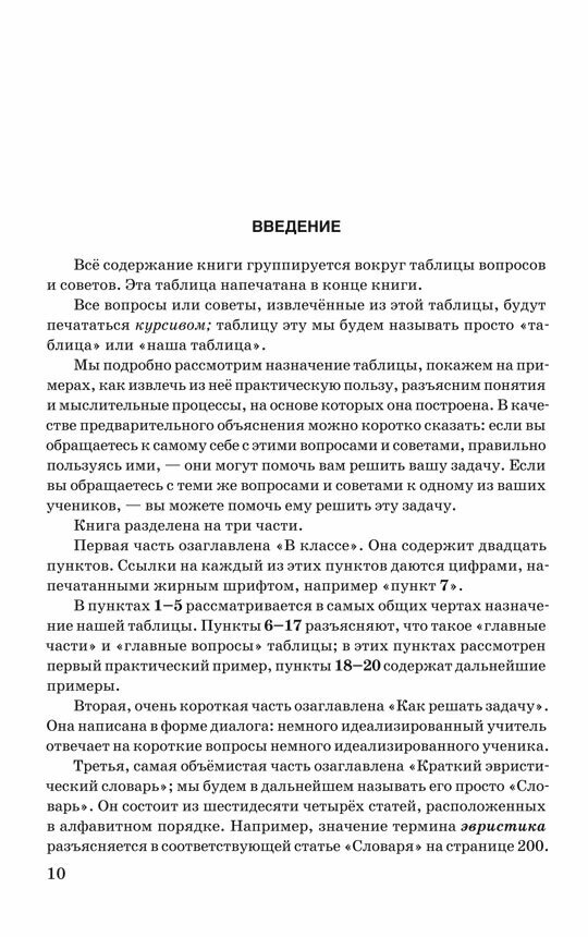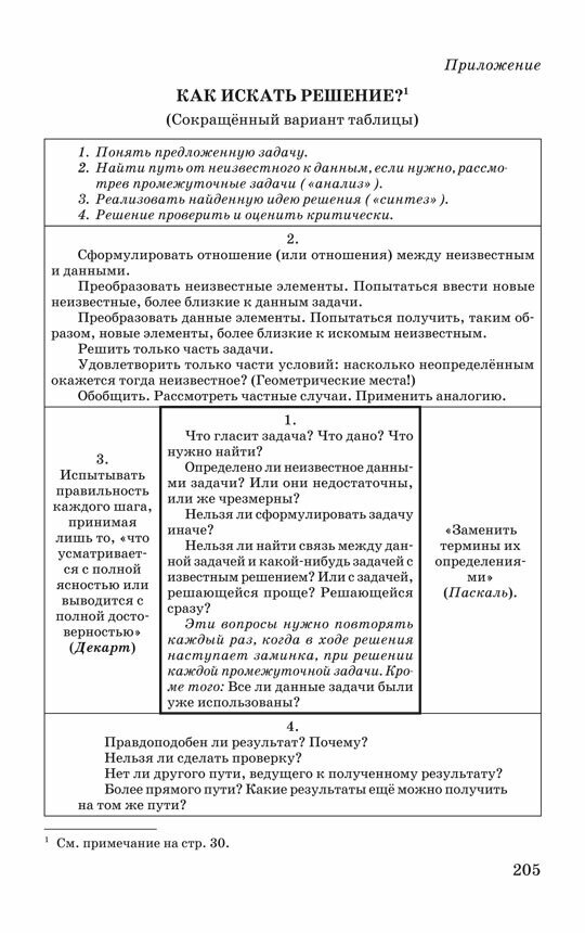 Теоретический материал состоит из трёх частей: работы над задачей в классе, построения и реализации плана её решения и краткого эвристического словаря. В качестве инструмента автор предлагает поэтапную схему ответов ученика на наводящие вопросы учителя.