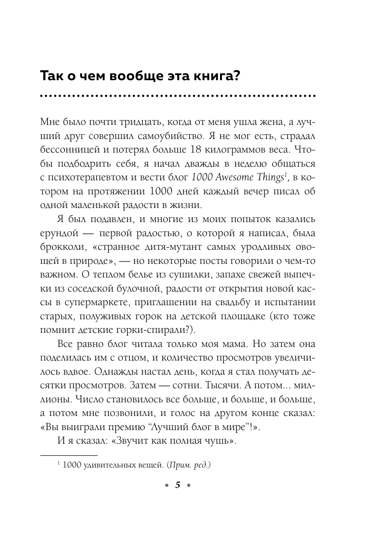 Автору этой книги довелось пройти через тяжелые испытания: смерть друга, расставание с возлюбленной, затяжная депрессия. Чтобы справиться с происходящим, он начал искать поводы для радости в каждом дне и писать о своих открытиях и наблюдениях в личном блоге, который очень быстро стал популярным.