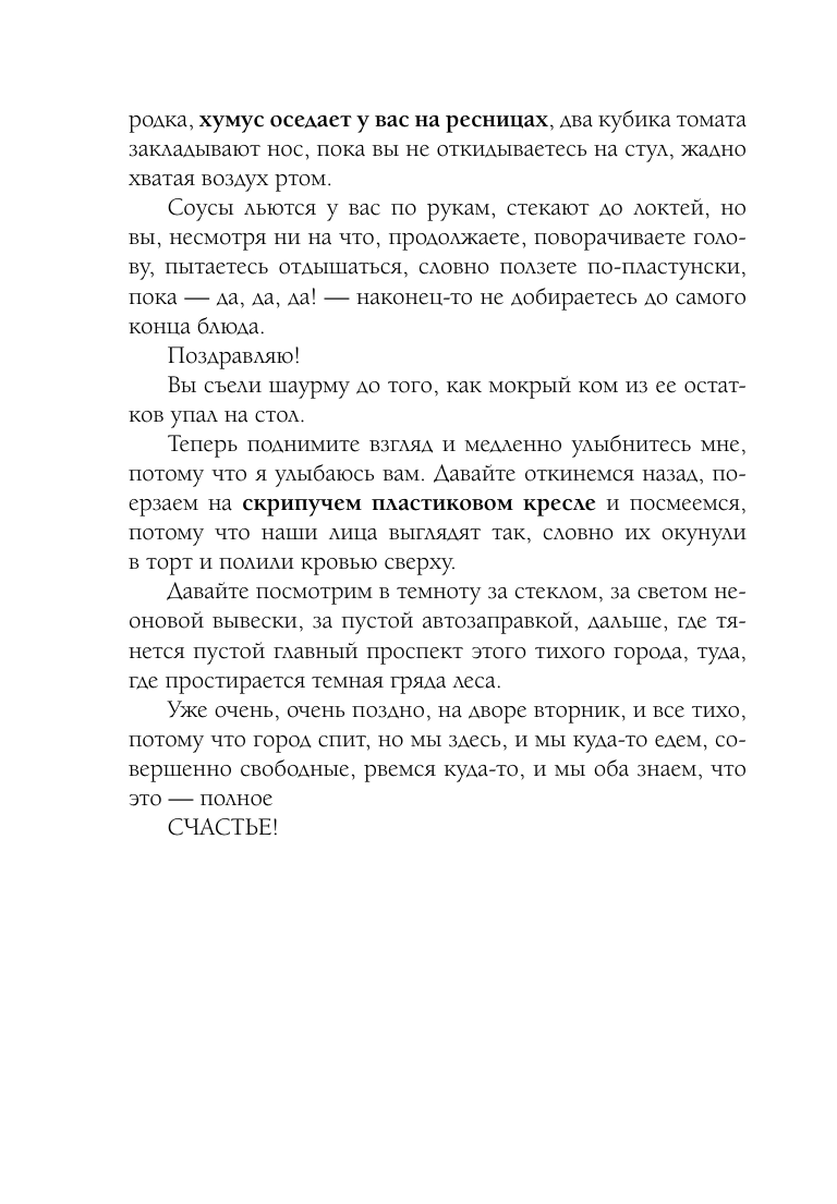 В книге вы найдете пространства для заметок. Следуя призыву автора, мы предлагаем вам стать соавторами этой книги и дополнить ее своими зарисовками о счастье. Менять фокус, видеть прекрасное в привычном, удивляться — вот оно