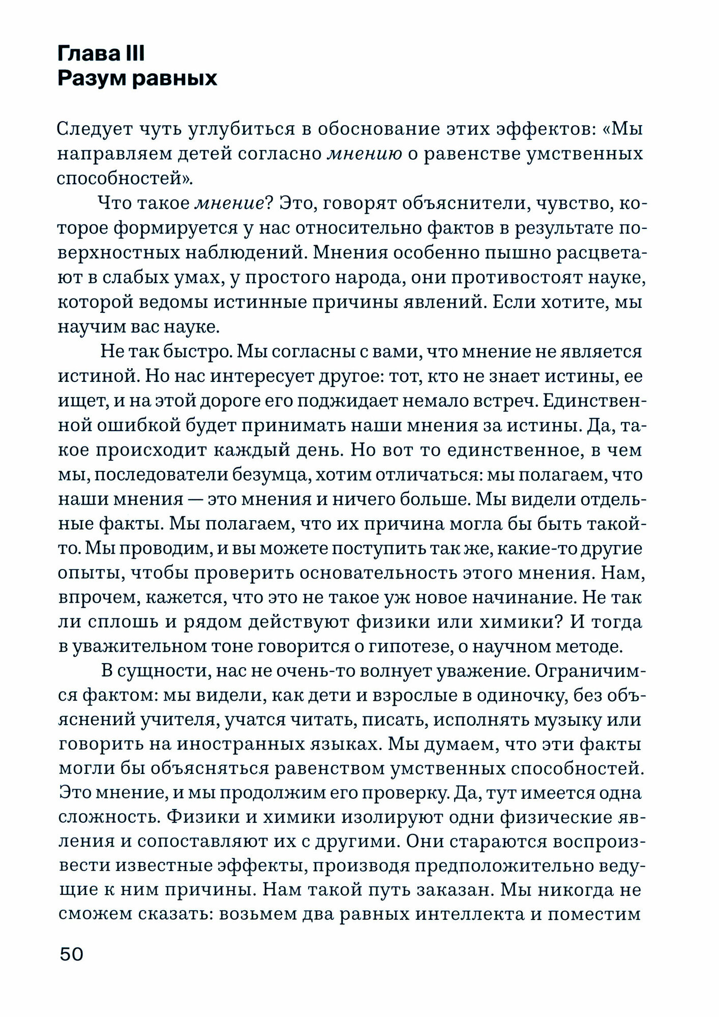 Жакото не знал фламандского языка, но обнаружил, что может преподавать на французском языке фламандским ученикам, не говорившим по-французски. Так он пришел к выводу, что знания как таковые не нужны для преподавания, а объяснение не является универсальным методом обучения. Результаты этого необычного педагогического эксперимента заставили Жакото признать, что все люди одинаково умны. Исходя из этого постулата, он разработал философию и метод «интеллектуальной эмансипации», позволяющей, например, неграмотным родителям самим обучать своих детей чтению. Книга посвящена описанию и анализу метода Жакото, его влиянию на понимание того, что такое процесс обучения, а также объясняет, почему, освободившись от гнета и иерархии интеллекта, мы получаем свободу и возможность наконец-то учиться чему-то новому.