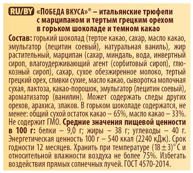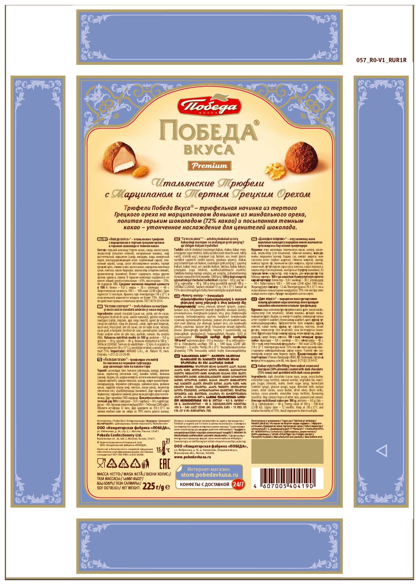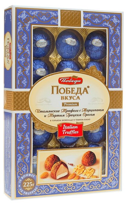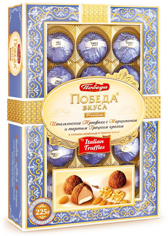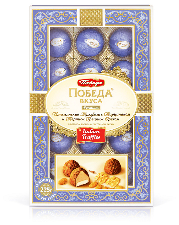 Кондитерская фабрика Победа выпустила новый продукт. Шоколадные трюфели Победа Вкуса с марципаном. Мы надеемся, что вы по достоинству оцените вкус шоколадных итальянских трюфелей с марципаном и тертым грецким орехом в горьком шоколаде и темном какао , который доставит вам неповторимое, утонченное наслаждение.