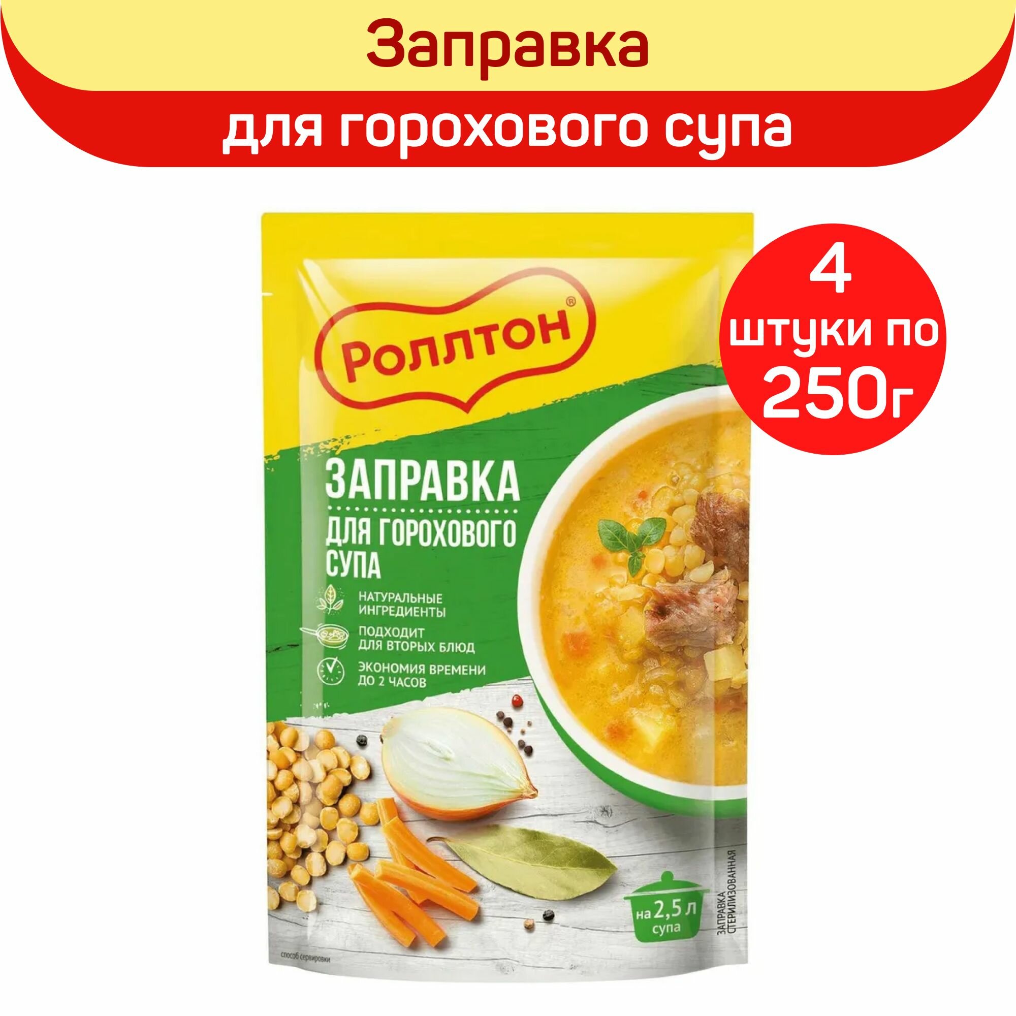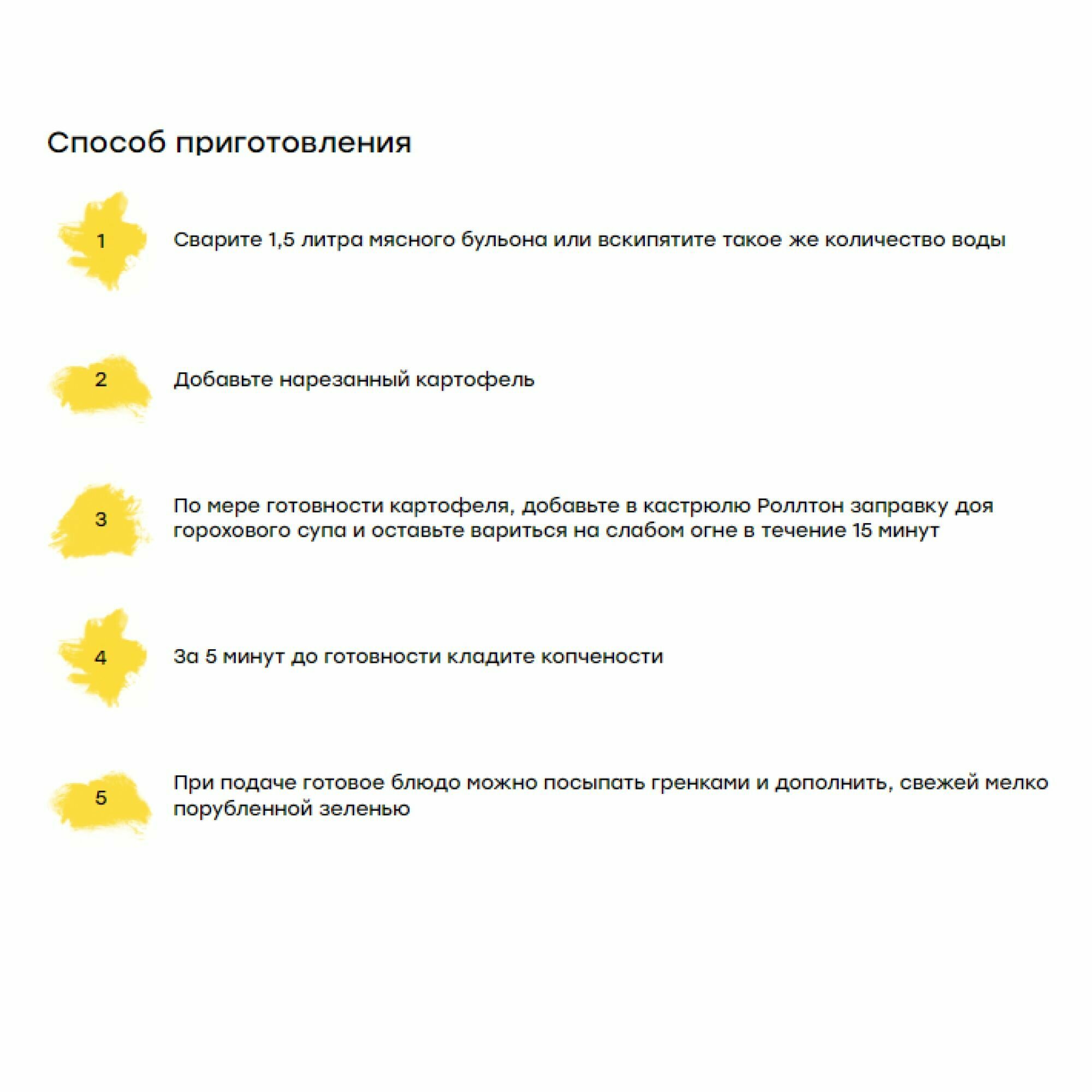 Вкусный гороховый суп теперь готовить легче и быстрее! Заправка «Роллтон» поможет хозяйке приготовить вкусный гороховый суп без лишних хлопот. Это все благодаря натуральным ингредиентам в составе: горох, морковь, лук, перец и зелень укропа. Просто и удобно: добавьте заправку в бульон и вкусный домашний суп готов!