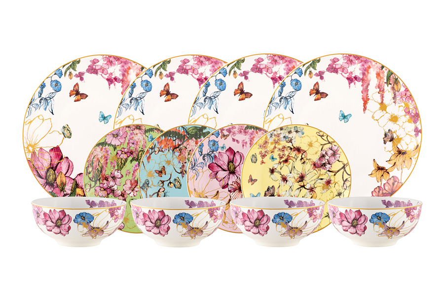 | Состав набора | 4 обеденные тарелки 27,5 см, 4 закусочные тарелки 19 см, 4 суповые тарелки 16 см, 0,65 л |
