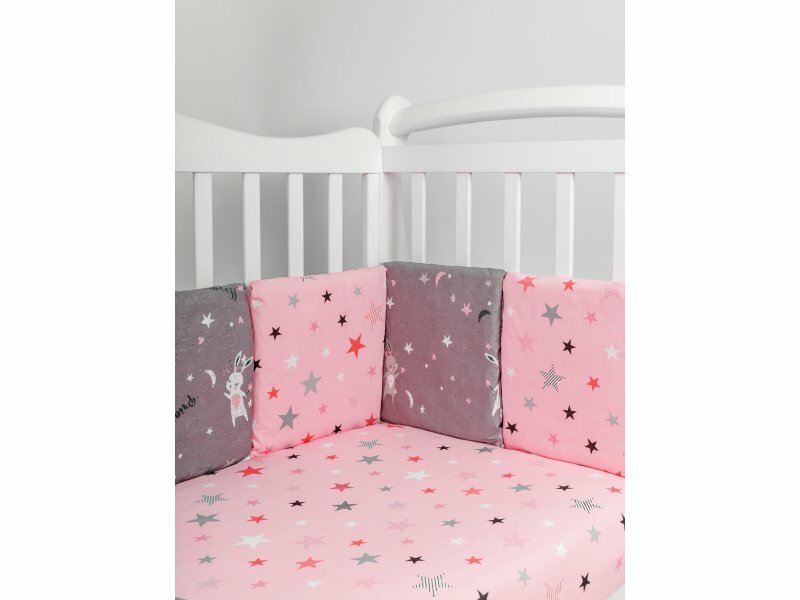 Бортики в комплекте представлены в виде 12-ти подушек на завязках, наволочки на бортиках съёмные. Мягкий наполнитель бортиков детского комплекта постельного белья обезопасит сон вашего малыша.