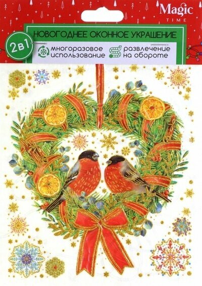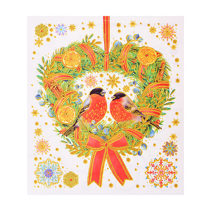 Новогоднее оконное украшение "Венок с птичками" может стать отличным декором стеклянных поверхностей дома. Яркая и красиая, наклейка идеально впишется в общий интерьер, порадует детей и взрослых. Наклейка выполнена из качественного ПВХ, отделана глиттером для беска. Замечательный вариант, когда не хочется возиться с декором самому.