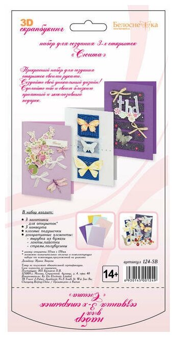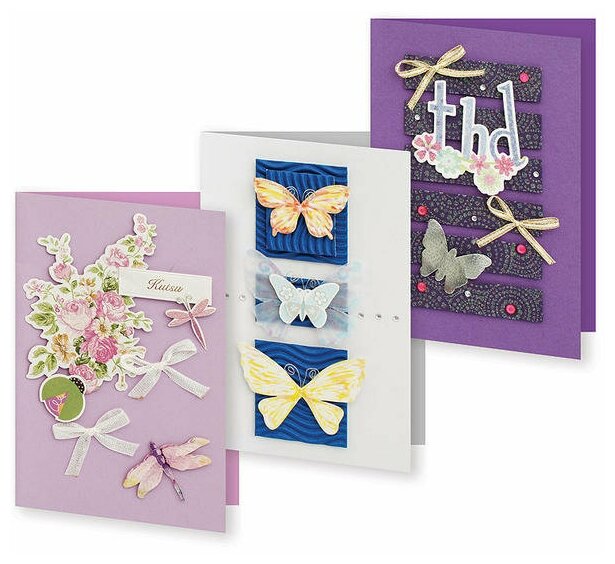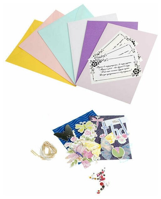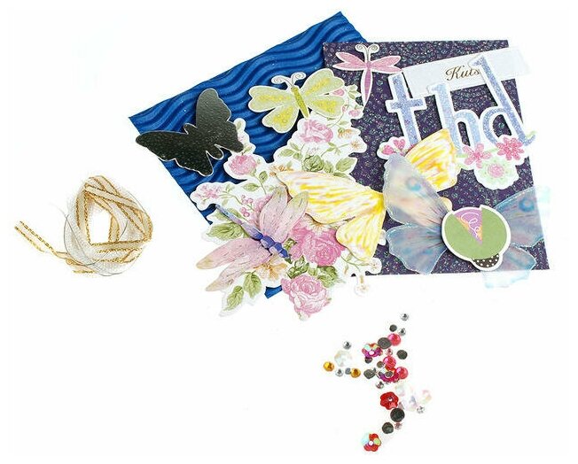 Наборы комплектуются цветными заготовками для открыток, ленточками, тесьмой и стразами разных форм. В каждый набор вложен комплект вырубки из картона — это красивые букеты, бабочки, карточки для надписей, рамки, игрушки, звездочки, воздушные шары и многое другое. В зависимости от модели вырубка будет разная. Еще одна отличительная особенность этих наборов на внутренней стороне вкладыша напечатаны карточки для скрапбукинга их можно вырезать и использовать при создании своей композиции.