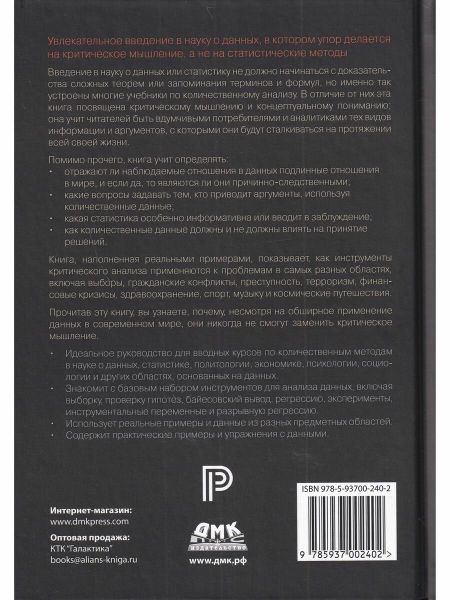 Введение в науку о данных или статистику не должно начинаться с доказательства сложных теорем или запоминания терминов и формул, но именно так устроены многие учебники по количественному анализу. В отличие от них эта книга посвящена критическому мышлению и концептуальному пониманию; она учит читателей быть вдумчивыми потребителями и аналитиками тех видов информации и аргументов, с которыми они будут сталкиваться на протяжении всей своей жизни.