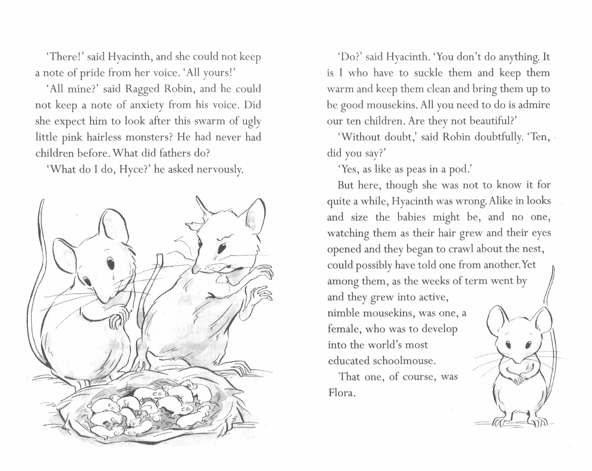 Flora lives in a classroom, and is determined to learn all sorts of things that no mouse has ever learned before. Her family is horrified at first, but then Flora's reading saves their lives ...