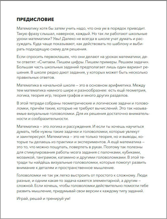 Развивающая тетрадь с головоломками и нестандартными задачами для семейного времяпрепровождения, интересного досуга ребенка с родителем и разностороннего развития. Задания различаются по сложности, но все они будут полезны как детям старшего дошкольного возраста, так и ученикам начальной школы.