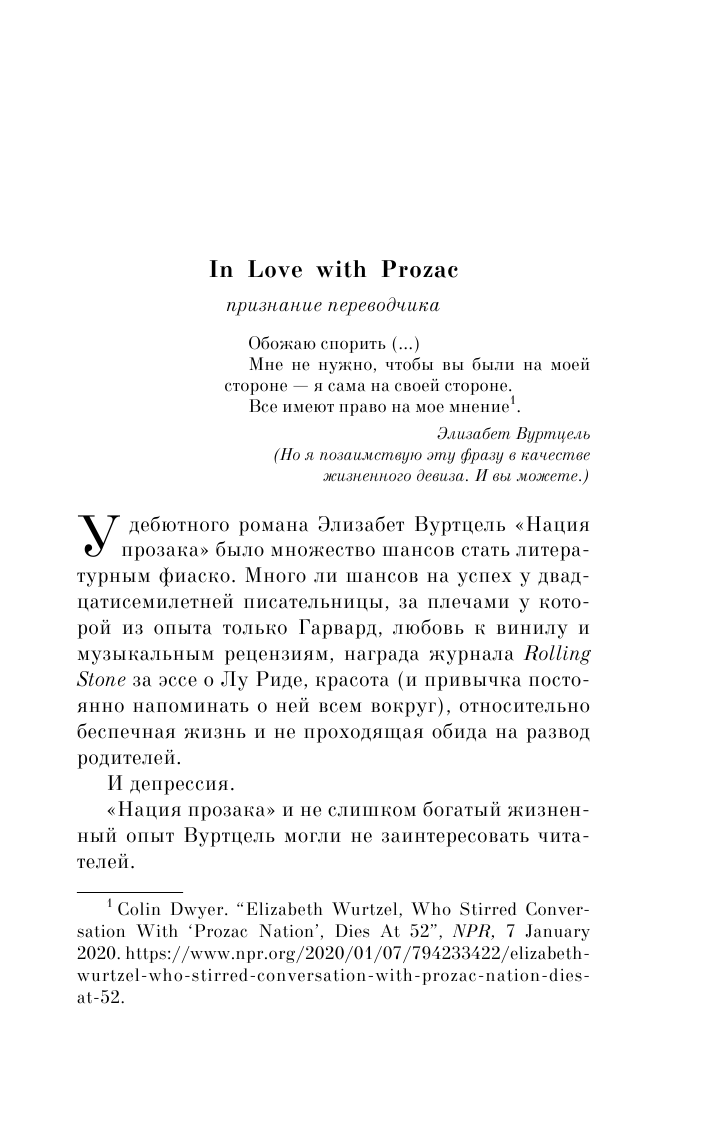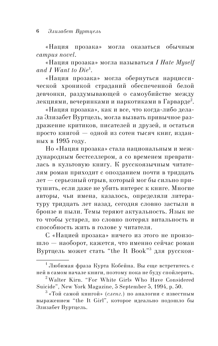 «Нация прозака» — культовые мемуары американской писательницы Элизабет Вуртцель, названной «голосом поколения Х». Роман стал не только национальным бестселлером, но и целым культурным феноменом, описывающим жизнь молодежи в 1980-е годы. Здесь поднимаются остросоциальные темы: ВИЧ, употребление алкоголя и наркотиков, ментальные расстройства, беспорядочные половые связи, нервные срывы. Проблемы молодого поколения описаны с поразительной откровенностью и эмоциональной уязвимостью, которые берут за душу любого, прочитавшего хотя бы несколько строк из этой книги.