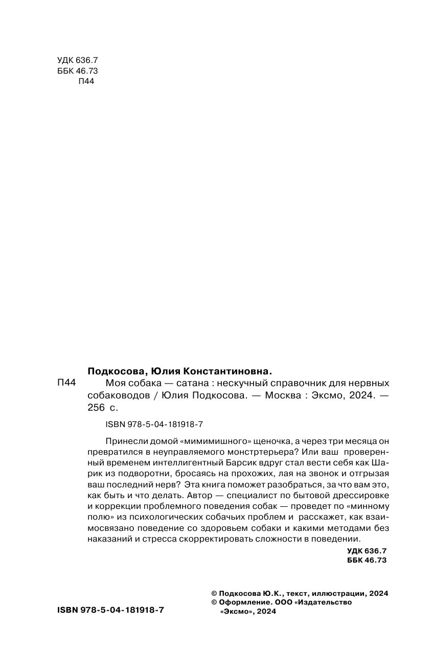 Моя собака - сатана. Нескучный справочник для нервных собаководов (Подкосова Юлия Константиновна); ООО "Издательство "Эксмо", 2023