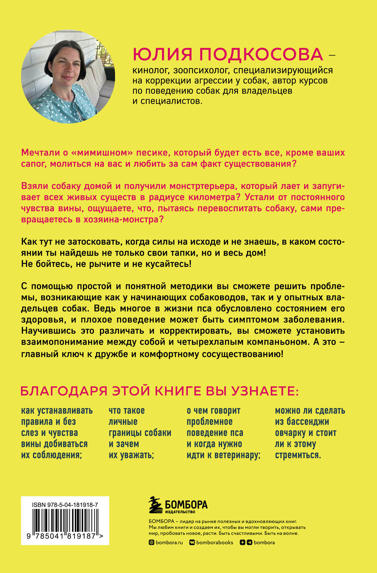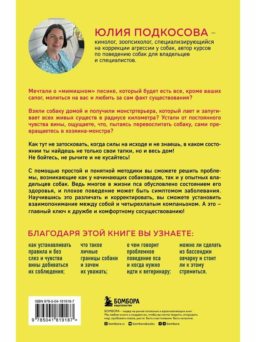 Автор книги Юлия Подкосова — специалист по коррекции поведения и психическому здоровью собак, создательница сайта K9 Friendly и «Гида по собаке», известного тысячам собаководов как в России, так и за рубежом. В этой книге она расскажет, как воспитать из вашего любимца не безропотного подчиненного, а полноценного члена семьи, с которым вам будет хорошо.