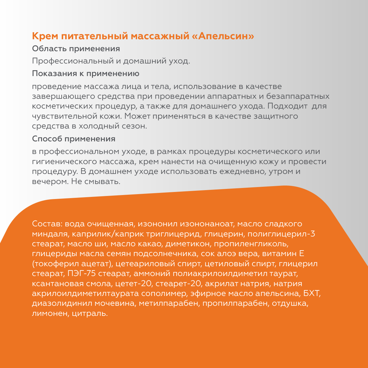 Питательный крем с легкой текстурой и нежным запахом сладкого апельсина. Быстро впитывается, не оставляя плёнки и жирного блеска. В состав входят масла сладкого апельсина, сладкого миндаля, ши и какао, которые делают кожу упругой и эластичной, увлажняют и питают. Крем предназначен для ежедневного применения при сухой и нормальной коже и для проведения массажа лица и тела при любом типе кожи. А также для использования в качестве завершающего средства при проведении аппаратных и без аппаратных косметических процедур. Подходит для чувствительной кожи. Может применяться в качестве защитного средства в холодный сезон.