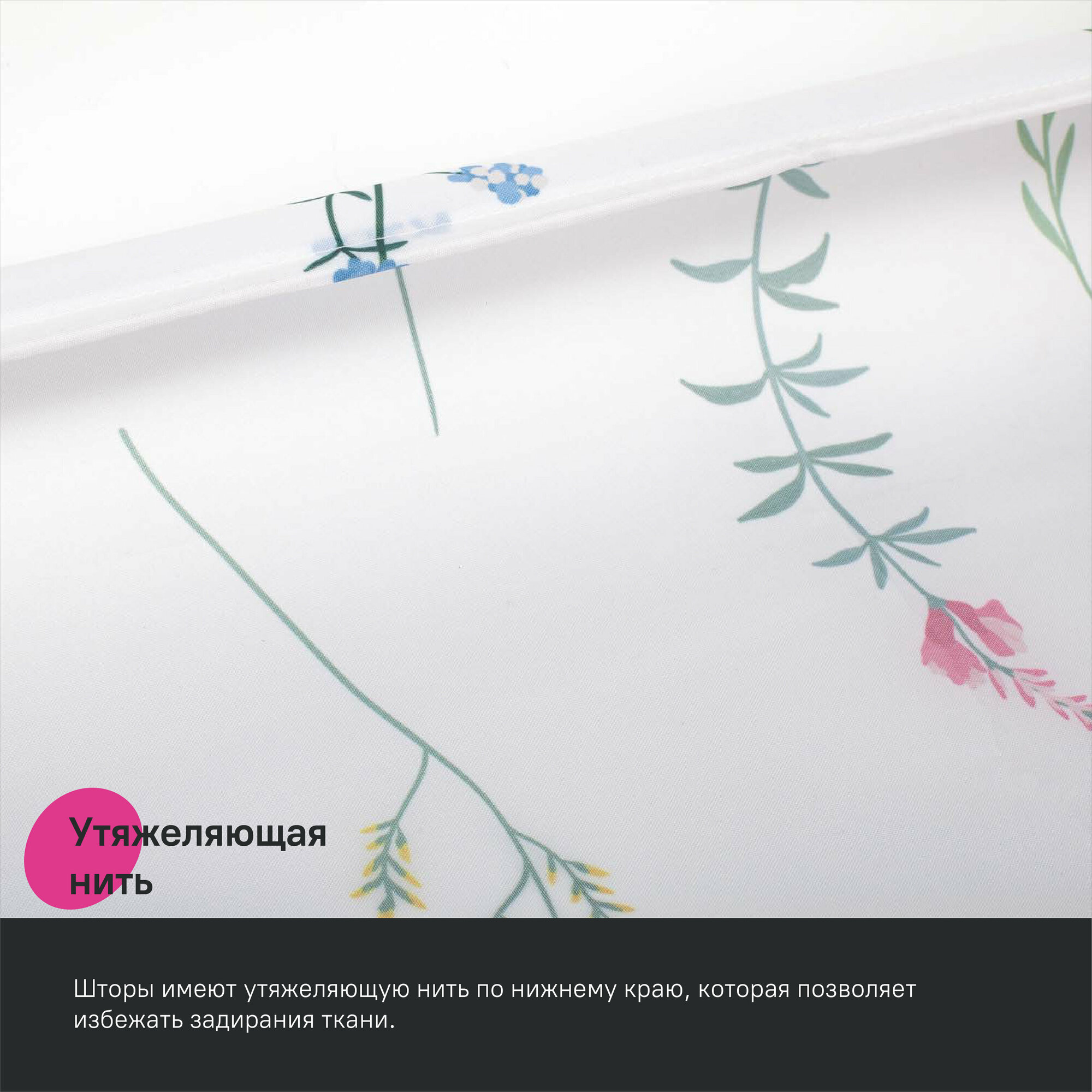 Текстильная штора для ванной белого цвета с красивым растительным узором из полевых цветов.• Изготовлена из износостойкого полиэстера с усиленной водонепроницаемой пропиткой. При попадании на ткань вода не впитывается, а скатывается каплями, даже при сильном напоре воды. • В комплекте 12 колец С-формы из прозрачного пластика. • По верхнему краю расположены 12 прозрачных пластиковых люверсов. • Штора имеет утяжеляющую нить по нижнему краю, которая позволяет избежать задирания ткани.• Легко ухаживать: шторку для ванной комнаты можно стирать в стиральной машине в деликатном режиме и гладить утюгом на минимальной температуре.Гарантия на текстильные аксессуары IDDIS® – 1 год.