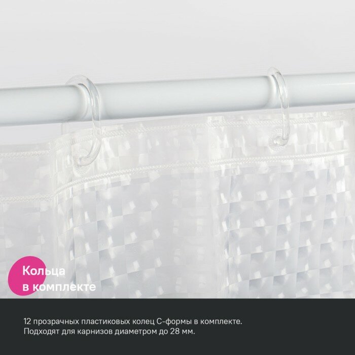 Полупрозрачная 3D-штора для ванной с рисунком из маленьких квадратов. Изготовлена из современного материала PEVA – мягкого, приятного на ощупь, экологичного и безвредного для здоровья термопластика (толщина 0,13 мм).• Без неприятного запаха, благодаря чему шторку для ванной можно использовать уже в день покупки.• В комплекте 12 прозрачных пластиковых колец С-формы.• По верхнему краю 12 штампованных отверстий-люверсов – кольцо/крючок легко пройдет насквозь, не повредив шторы.• Материал PEVA на 100% водонепроницаем и надежно защищает от брызг, не подвержен развитию плесени и грибка.• Просто ухаживать: достаточно протереть салфеткой с мылом и промыть под душем. При этом штору можно даже не снимать с карниза.Гарантия на текстильные аксессуары IDDIS® – 1 год.