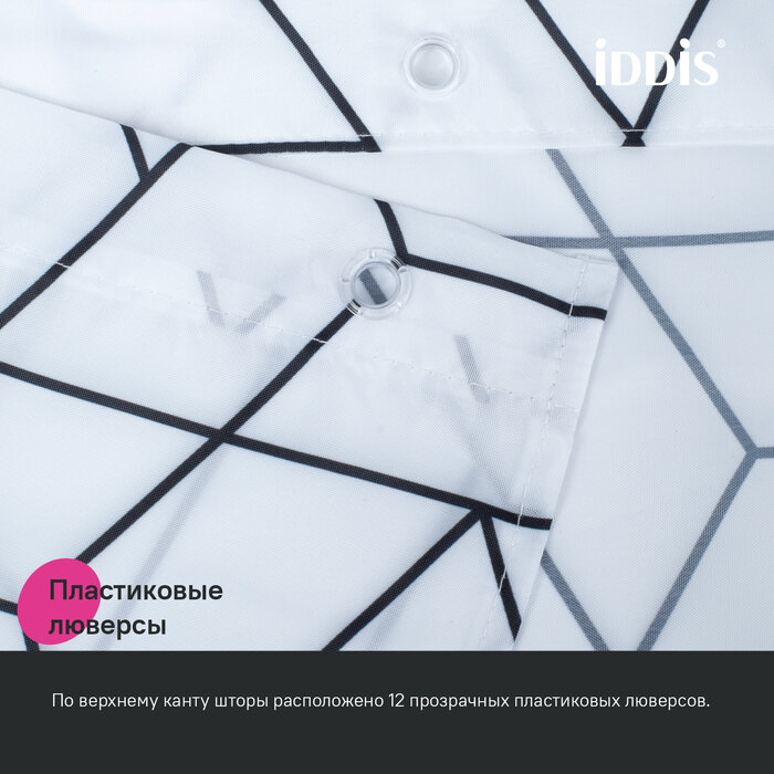 Текстильная штора для ванной белого цвета с черным геометричным принтом.• Изготовлена из износостойкого полиэстера с усиленной водонепроницаемой пропиткой. При попадании на ткань вода не впитывается, а скатывается каплями, даже при сильном напоре воды. • В комплекте 12 колец С-формы из прозрачного пластика. • По верхнему краю расположены 12 прозрачных пластиковых люверсов. • Штора имеет утяжеляющую нить по нижнему краю, которая позволяет избежать задирания ткани.• Легко ухаживать: шторку для ванной комнаты можно стирать в стиральной машине в деликатном режиме и гладить утюгом на минимальной температуре.Гарантия на текстильные аксессуары IDDIS® – 1 год.