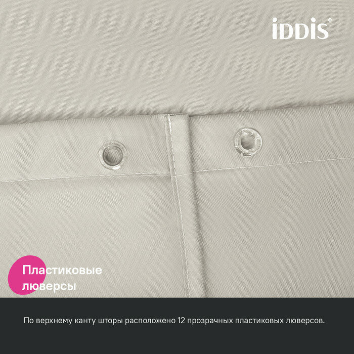 Текстильная штора для ванной стильного графитового цвета будет гармонично смотреться и в светлом, и в темном интерьере.• Изготовлена из износостойкого полиэстера с водоотталкивающей пропиткой. При попадании на ткань вода не впитывается, а скатывается каплями, даже при сильном напоре воды. • В комплекте 12 колец С-формы из прозрачного пластика. • По верхнему краю расположены 12 прозрачных пластиковых люверсов. • Штора имеет утяжеляющую нить по нижнему краю, которая позволяет избежать задирания ткани.• Легко ухаживать: шторку для ванной комнаты можно стирать в стиральной машине в деликатном режиме и гладить утюгом на минимальной температуре.Гарантия на текстильные аксессуары IDDIS® – 1 год.