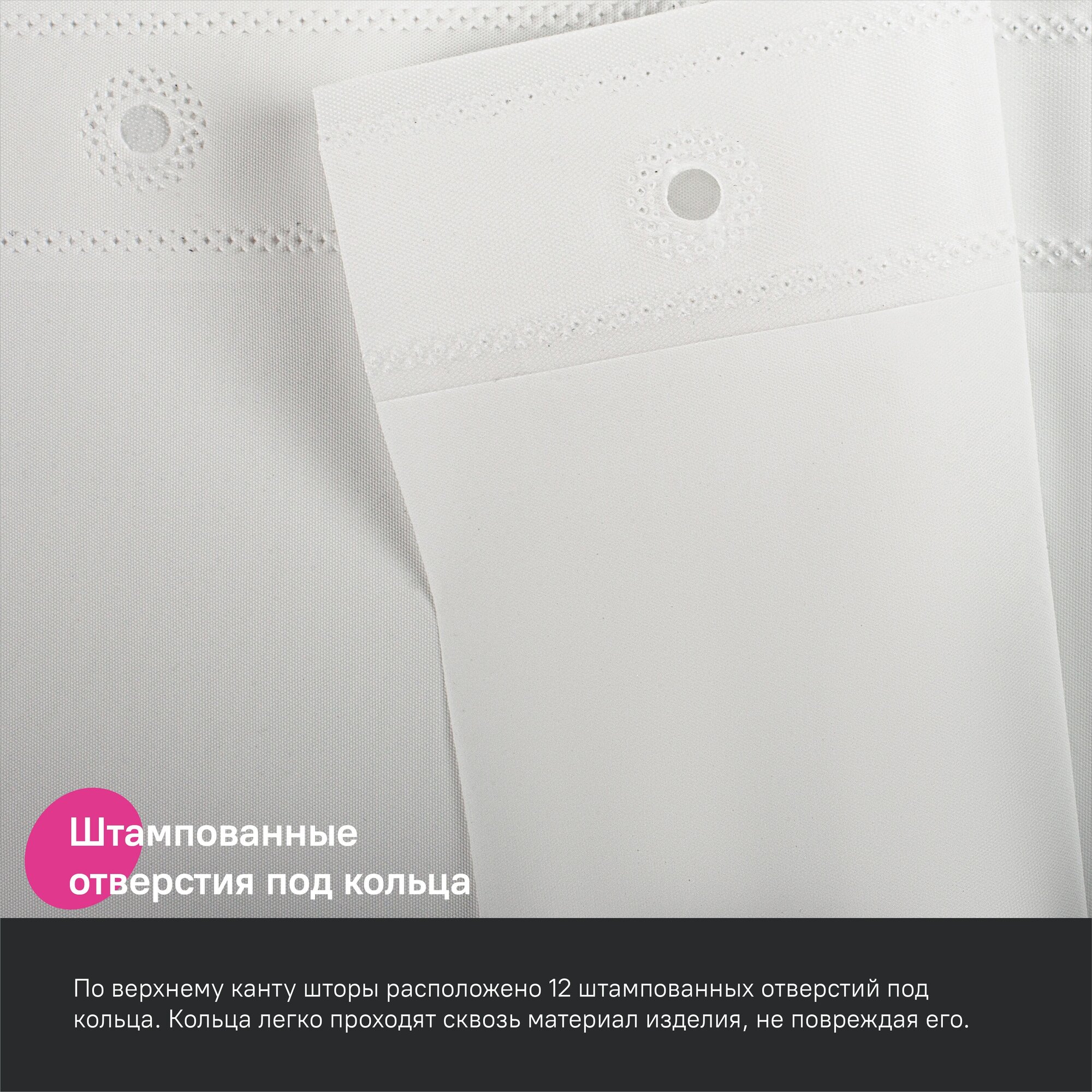 Однотонная непрозрачная белая штора для ванной. Изготовлена из современного материала PE – мягкого, прочного, приятного на ощупь, экологичного и безвредного для здоровья термопластика (толщина 0,09 мм).• Без неприятного запаха, благодаря чему шторку для ванной можно использовать уже в день покупки. • 12 прозрачных пластиковых колец в комплекте, штора готова к использованию. • По верхнему краю 12 штампованных отверстий-люверсов – кольцо/крючок легко пройдет насквозь, не повредив шторы. • Материал PE на 100% водонепроницаем и надежно защищает от брызг, не подвержен развитию плесени и грибка.• Просто ухаживать: достаточно протереть салфеткой с мылом и промыть под душем. При этом штору можно даже не снимать с карниза. Гарантия на текстильные аксессуары IDDIS® – 1 год.