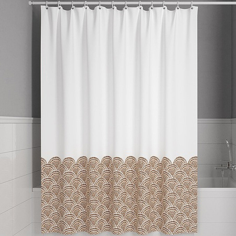 Текстильная штора для ванной белого цвета с карамельно-коричневым принтом в виде волн в средиземноморском стиле. Штора освежит пространство и привнесет в него легкое настроение. • Изготовлена из износостойкого полиэстера с водоотталкивающей пропиткой. При попадании на ткань вода не впитывается, а скатывается каплями, даже при сильном напоре воды. • В комплекте 12 колец С-формы из прозрачного пластика. • По верхнему краю расположены 12 прозрачных пластиковых люверсов. • Штора имеет утяжеляющую нить по нижнему краю, которая позволяет избежать задирания ткани.• Легко ухаживать: шторку для ванной комнаты можно стирать в стиральной машине в деликатном режиме и гладить утюгом на минимальной температуре.Гарантия на текстильные аксессуары IDDIS® – 1 год.