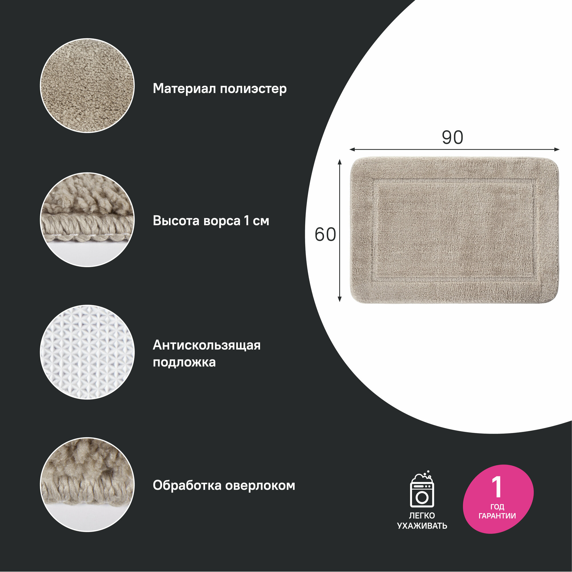 Мягкий коврик для ванной стильного светло-коричневого цвета с плотным невысоким ворсом (1 см), очень приятный на ощупь. Ворс из микрофибры отлично держит форму, легко чистится и быстро сохнет. • Этот коврик в ванную противоскользящий: основа из экологичной термопластичной резины (TPR) позволяет не скользить на гладком и влажном кафеле. Подходит для использования в помещениях с теплыми полами. • Благодаря современным влагостойким материалам и качественной обработке краев коврик не потеряет яркости красок, не обветшает и надолго останется привлекательным как в день покупки.• Несложно ухаживать: разрешена деликатная стирка при температуре до 40оС с жидким моющим средством; не сушить на батарее, избегать солнечных лучей.Гарантия на текстильные аксессуары IDDIS® – 1 год.