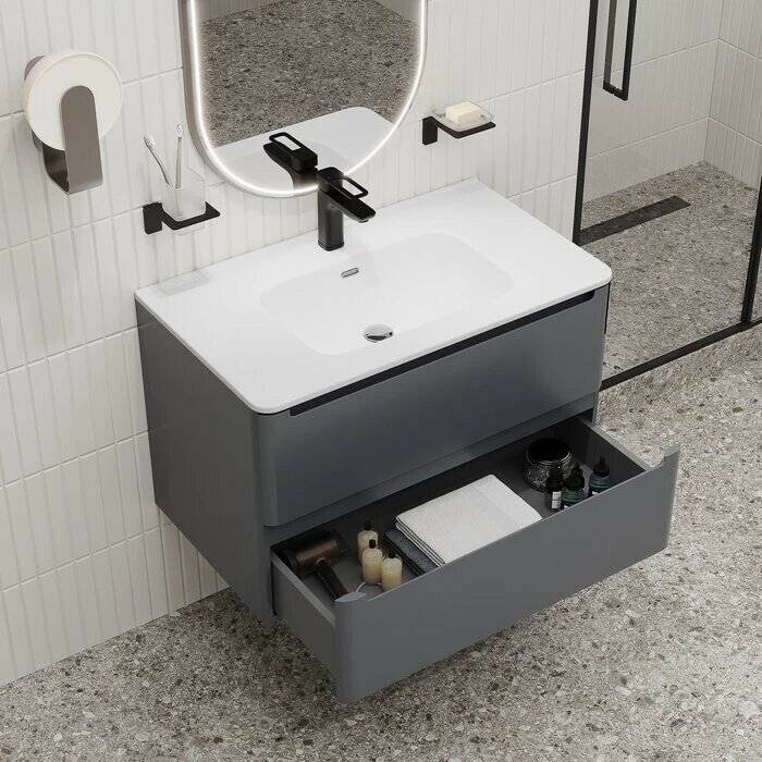 Подвесная тумба с плоским умывальником Edifice стильного темно-серого цвета – воплощение современного минимализма. Мягкие линии корпуса в сочетании с удобными интегрированными ручками выглядят свежо и актуально. Смотрится аккуратно, легко и не усложняет процесс уборки в ванной благодаря подвесной конструкции. В комплекте умывальник (арт. 0108000i28) из качественного фарфора. Он отличается высокой прочностью и прост в уходе: не задерживает загрязнения и неприятные запахи, надолго сохраняя первозданную белизну. Два выдвижных ящика закрываются плавно и бесшумно благодаря высококачественным скрытым направляющим с доводчиками немецкого производства. Надежные крепления рассчитаны на большой вес и позволяют равномерно распределять нагрузку. Фурнитура рассчитана на 30 000 открываний, что составляет более 10 лет исправной работы.