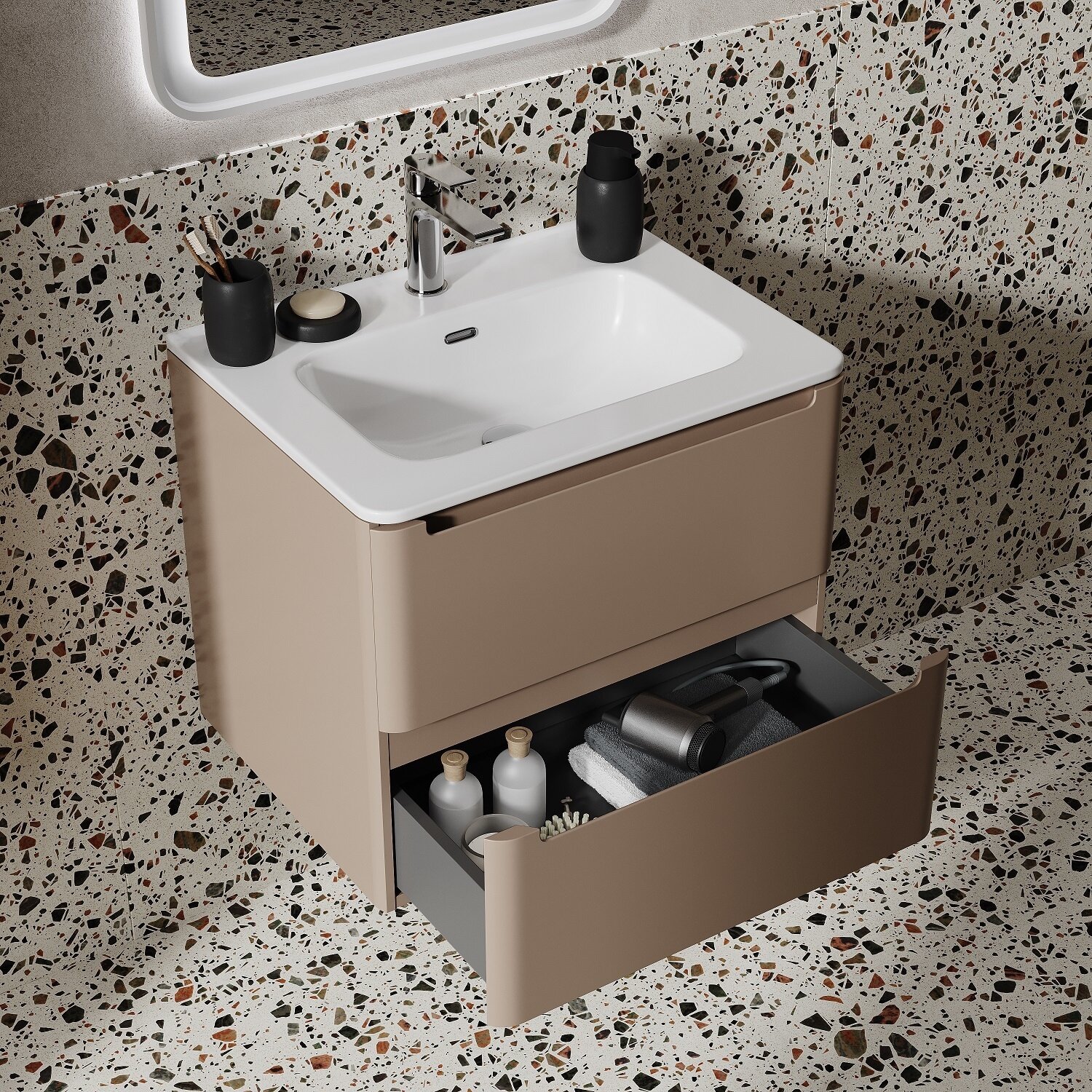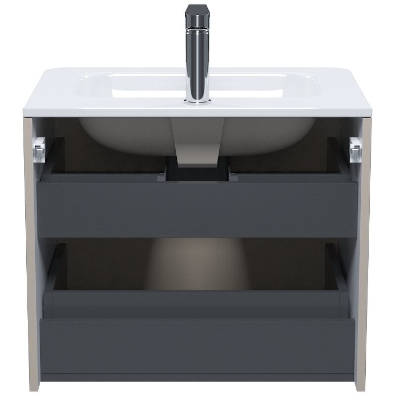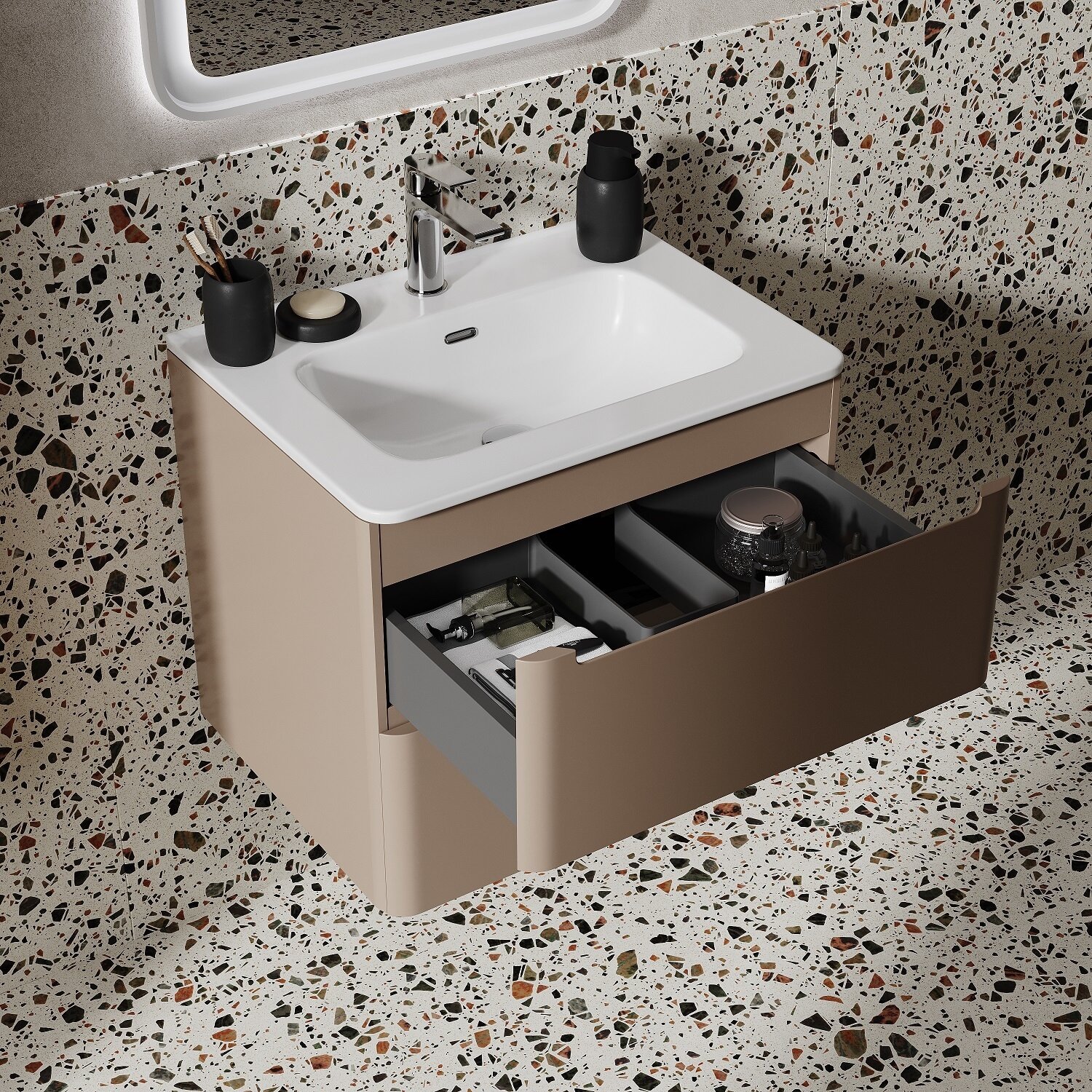Компактная подвесная тумба с плоским умывальником Edifice в теплом оттенке капучино – воплощение современного минимализма. Мягкие линии корпуса в сочетании с удобными интегрированными ручками выглядят свежо и актуально. Смотрится аккуратно, легко и не усложняет процесс уборки в ванной благодаря подвесной конструкции. В комплекте умывальник (арт. 0106000i28) из качественного фарфора. Он отличается высокой прочностью и прост в уходе: не задерживает загрязнения и неприятные запахи, надолго сохраняя первозданную белизну. Два выдвижных ящика закрываются плавно и бесшумно благодаря высококачественным скрытым направляющим с доводчиками немецкого производства. Надежные крепления рассчитаны на большой вес и позволяют равномерно распределять нагрузку. Фурнитура рассчитана на 30 000 открываний, что составляет более 10 лет исправной работы.