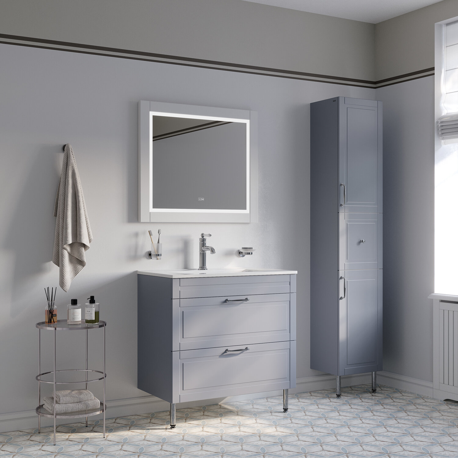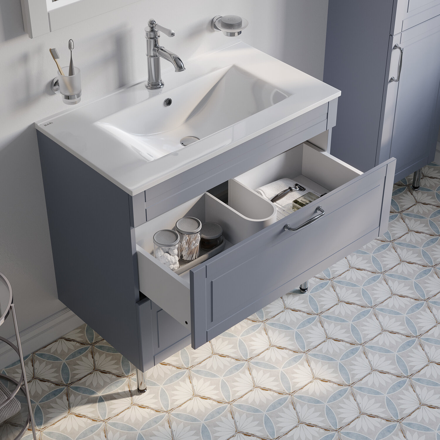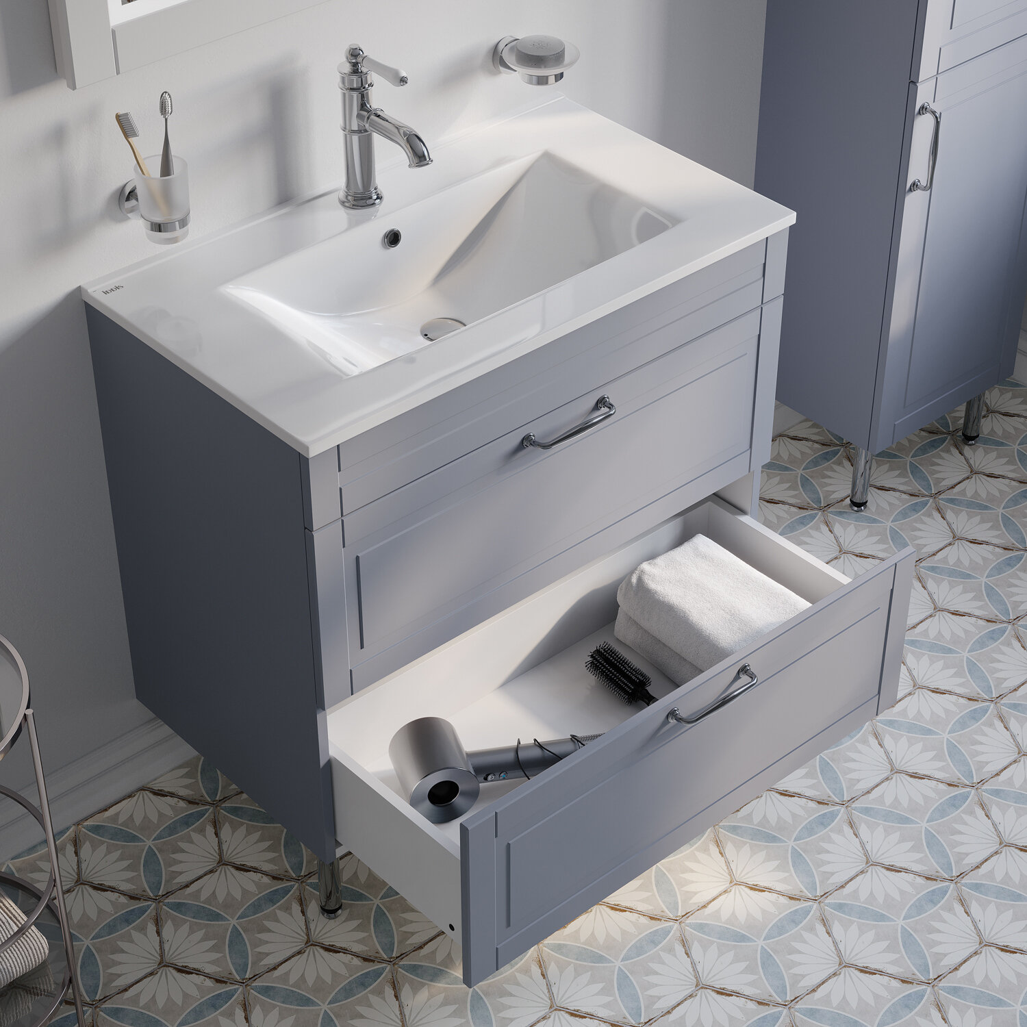 Напольная тумба Oxford изысканного светло-серого цвета (Код цвета по таблице Ral (универсальная цветовая система) – RAL7046) – модное сочетание классического стиля и стиля ретро. Она органично впишется в интерьер благодаря элегантному фрезерованному фасаду и узнаваемому дизайну. В комплекте плоский эргономичный умывальник.• Два просторных выдвижных ящика закрываются плавно и бесшумно благодаря высококачественным скрытым направляющим с доводчиками немецкого производства.• Хромированные ножки и ручки дополняют цвет фасада и сочетаются с дизайном одноименных смесителей IDDIS® и смесителей в стиле ретро. Несложно подобрать все необходимое для создания гармоничного интерьера.• Поверхность фасадов бархатистая, приятная на ощупь. Это ощущение создает полуматовая полимерная эмаль с эффектом soft touch. • Фурнитура рассчитана на 30 000 открываний – это более 10 лет исправной работы.Гарантия на мебель IDDIS® – 3 года.