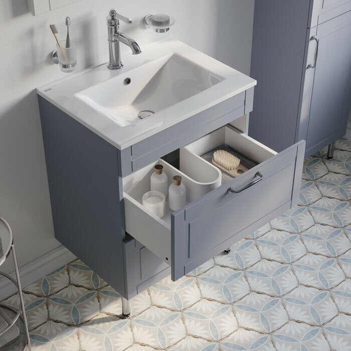 Компактная напольная тумба Oxford изысканного светло-серого цвета (Код цвета по таблице Ral (универсальная цветовая система) – RAL7046) – модное сочетание классического стиля и стиля ретро. Она органично впишется в интерьер благодаря элегантному фрезерованному фасаду и узнаваемому дизайну. В комплекте плоский эргономичный умывальник.• Два просторных выдвижных ящика закрываются плавно и бесшумно благодаря высококачественным скрытым направляющим с доводчиками немецкого производства.• Хромированные ножки и ручки дополняют цвет фасада и сочетаются с дизайном одноименных смесителей IDDIS® и смесителей в стиле ретро. Несложно подобрать все необходимое для создания гармоничного интерьера.• Поверхность фасадов бархатистая, приятная на ощупь. Это ощущение создает полуматовая полимерная эмаль с эффектом soft touch. • Фурнитура рассчитана на 30 000 открываний – это более 10 лет исправной работы.Гарантия на мебель IDDIS® – 3 года.