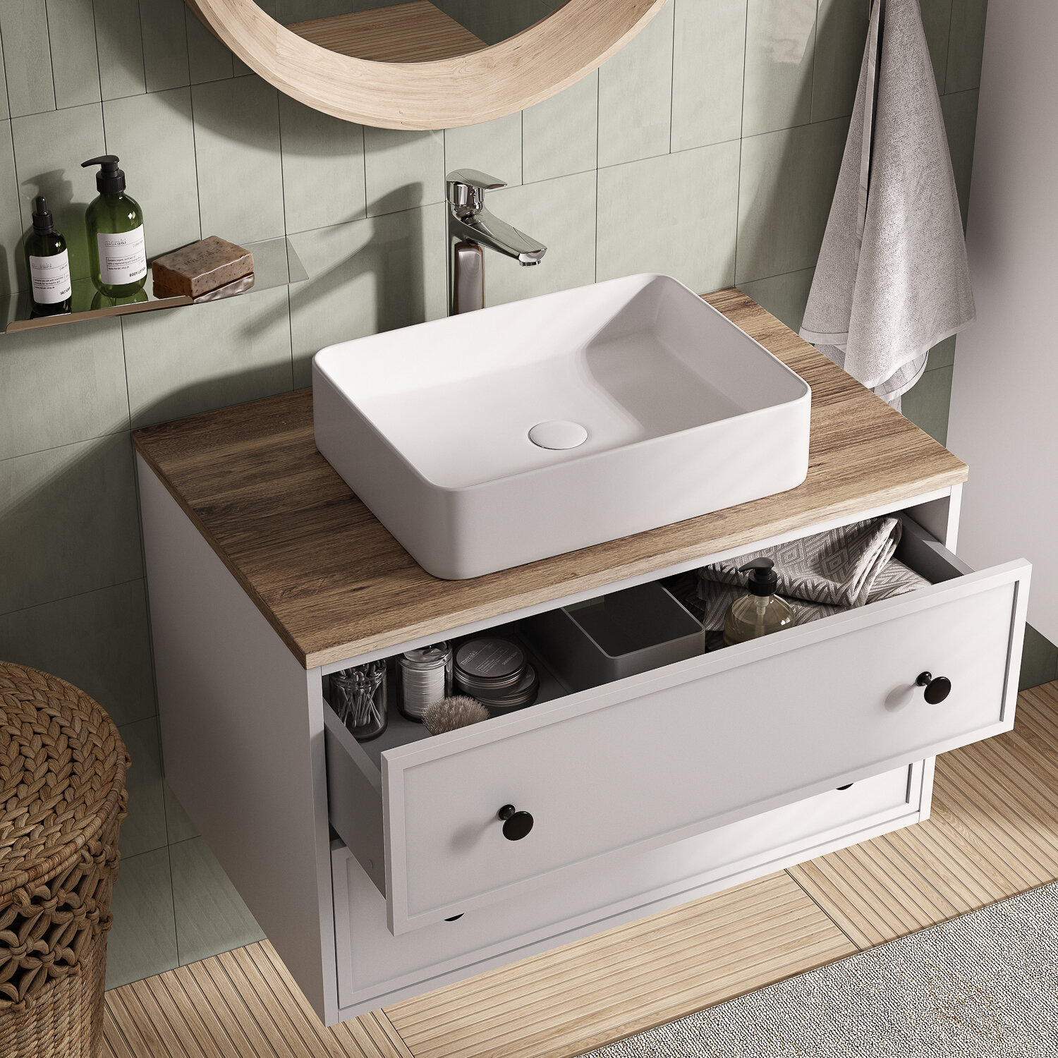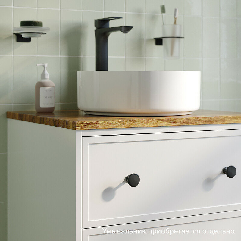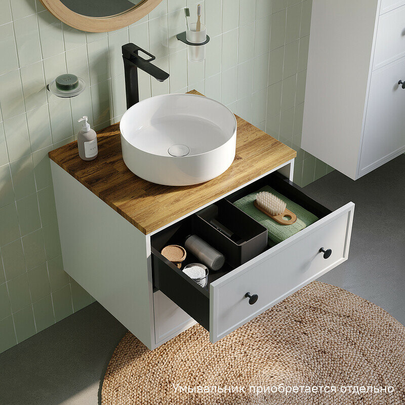 Компактная подвесная тумба Torr трендового темно-серого цвета со столешницей из клееного натурального дуба. Сочетает в себе узнаваемый стиль и практичность популярного скандинавского дизайна. Ее четкие формы, теплый цвет дерева, фасады с декоративной филенкой, круглые ручки смотрятся гармонично и впишутся в любой современный интерьер. Подойдет любой накладной умывальник, покупается отдельно.• Два просторных выдвижных ящика закрываются плавно и бесшумно благодаря высококачественным скрытым направляющим с доводчиками Hettich. Внутри ящики графитового цвета – стильно и практично.• Покрытие качественной влагостойкой пленкой, разработанной для использования в помещениях с высокой влажностью, сохранит первоначальный вид мебели надолго (при должном уходе). • Надежная фурнитура Hettich рассчитана на 30 000 открываний – это более 10 лет исправной работы.Гарантия на мебель IDDIS® – 3 года.