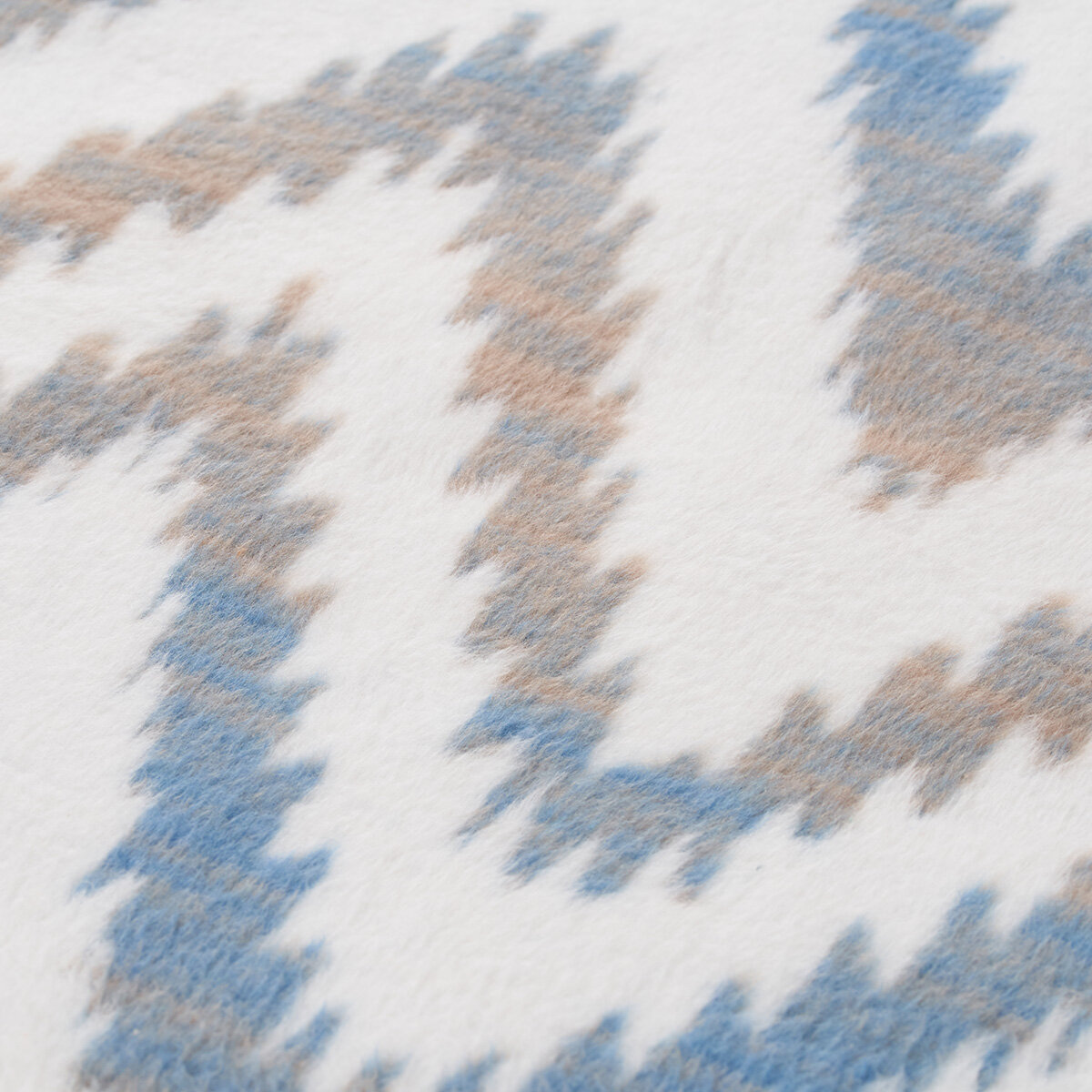 Дизайн пледа выполнен в кантри стиле с геометрическим орнаментом в природной палитре приятных оттенков терракотово-красного, кофейно-молочного, оливкового, небесно-голубого и белого цветов. Края пледа декорированы бахромой.