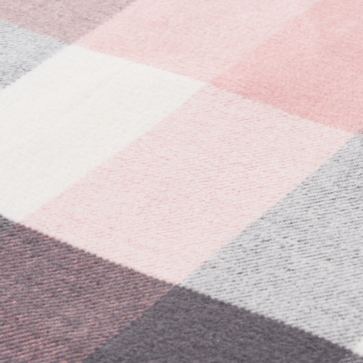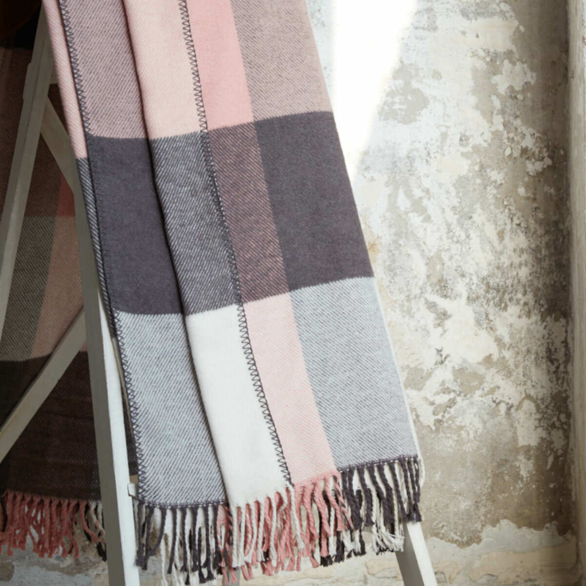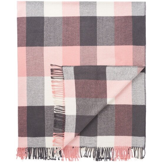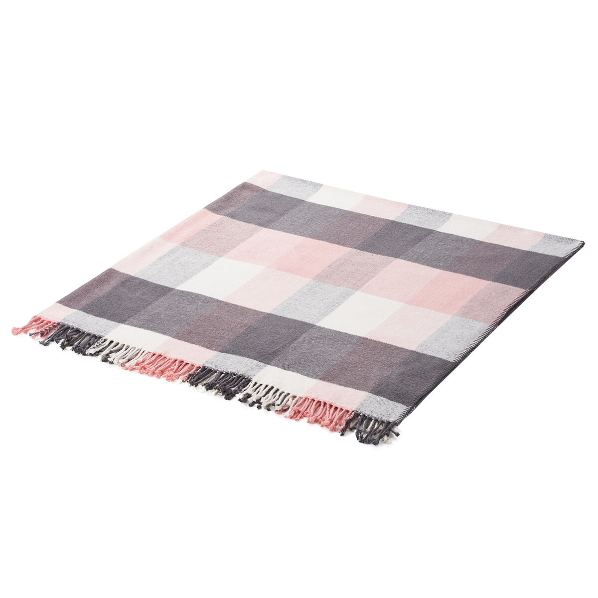 Это классический клетчатый плед в скандинавском стиле и характерных оттенках пепельно-розового и дымчато-серого цветов. Края пледа декорированы бахромой.