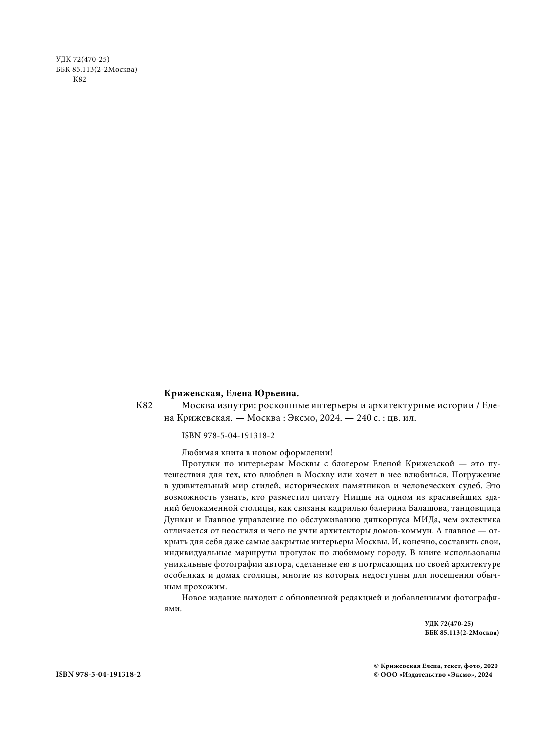 Прогулки по интерьерам Москвы с блогером Еленой Крижевской — это путешествия для тех, кто влюблен в Москву или хочет в нее влюбиться. Погружение в удивительный мир стилей, исторических памятников и человеческих судеб. Это возможность узнать, кто разместил цитату Ницше на одном из красивейших зданий белокаменной столицы, как связаны кадрилью балерина Балашова, танцовщица Дункан и Главное управление по обслуживанию дипкорпуса МИДа, чем эклектика отличается от неостиля и чего не учли архитекторы домов-коммун. А главное — открыть для себя даже самые закрытые интерьеры Москвы. И, конечно, составить свои, индивидуальные маршруты прогулок по любимому городу. В книге использованы уникальные фотографии автора, сделанные ею в потрясающих по своей архитектуре особняках и домах столицы, многие из которых не доступны для посещения обычным прохожим.