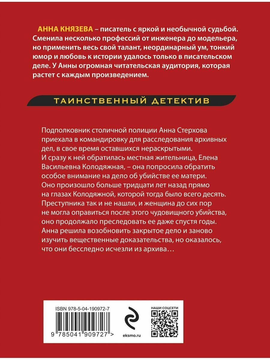 Подполковник столичной полиции Анна Стерхова приехала в командировку для расследования архивных дел, в свое время оставшихся нераскрытыми. И сразу к ней обратилась местная жительница, Елена Васильевна Колодяжная — она попросила обратить особое внимание на дело об убийстве ее матери. Оно произошло больше тридцати лет назад прямо на глазах Колодяжной, которой тогда было всего десять. Преступника так и не нашли, и женщина до сих пор не могла оправиться после этого чудовищного убийства, оно продолжало преследовать ее даже спустя годы. Анна решила возобновить закрытое дело и заново изучить вещественные доказательства, но оказалось, что они бесследно исчезли из архива…