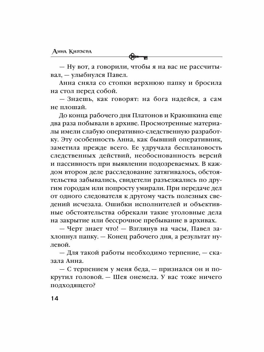 В остросюжетных романах Анны Князевой расследуются преступления, следы которых уводят в прошлое и позволяют пролить свет на его загадки. Вслед за героями вы отправитесь навстречу старинным тайнам и увлекательным приключениям!