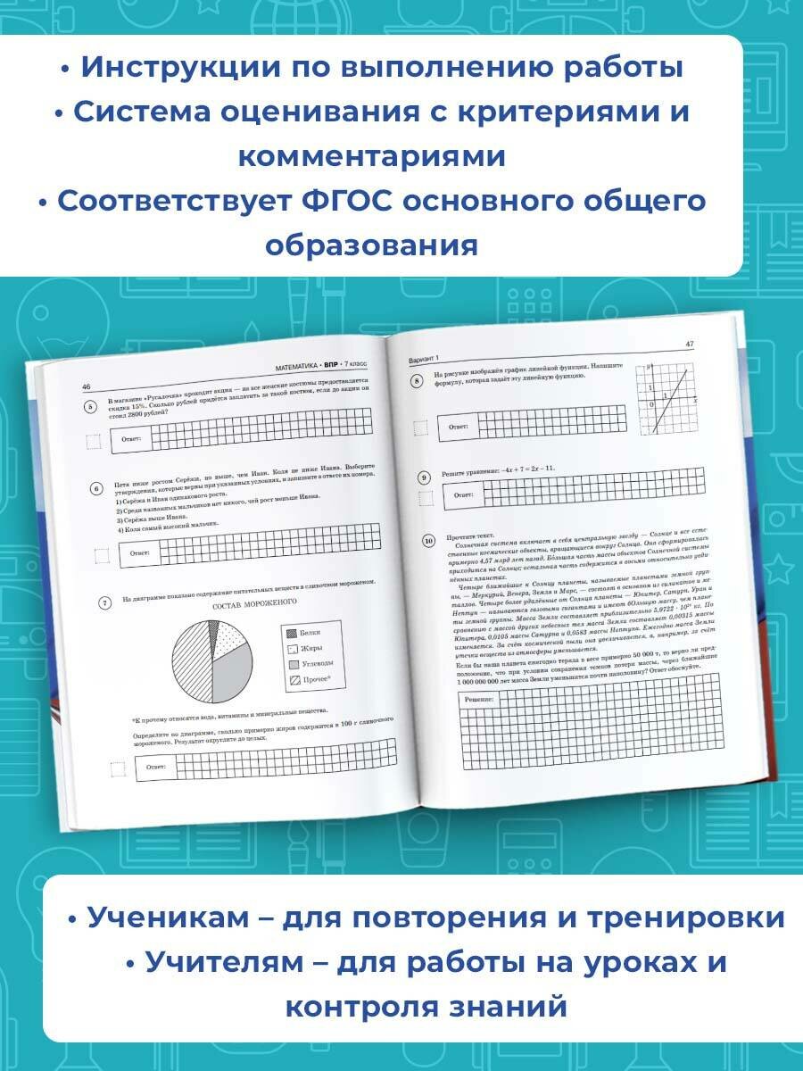 Пособие содержит 40 тренировочных вариантов проверочных работ по русскому языку, математике, истории, обществознанию, физике, биологии, географии и английскому языку - предметам, по которым пишут ВПР в 7 классе на всей территории страны.