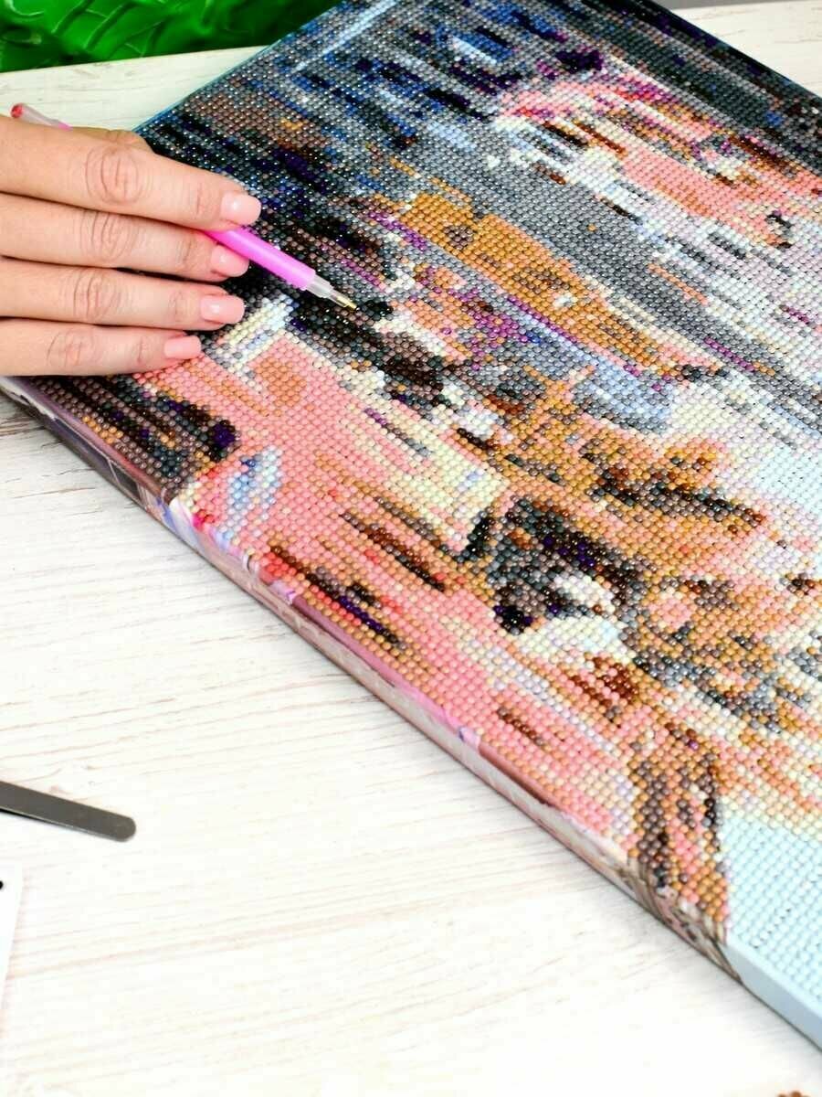 В наборе: холст на подрамнике с напечатанной картиной, покрытый клеевым слоем и защитной пленкой, пакеты со стразами (24 цвета страз), стилус, лоток для страз, силикон для страз, клей, пинцет металлический, схема, дополнительные пакеты с zip-молнией, стикеры для нумерации zip-пакетов.