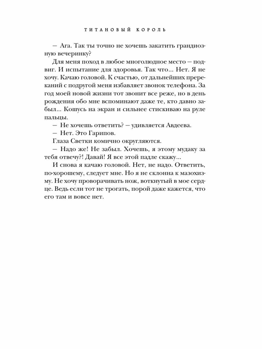 «Титановый король» — это психологический роман, в котором рассказывается о воле к жизни, даже когда цепляться, казалось бы, не за что. Два сломленных человека встречаются, чтобы навсегда изменить жизни друг друга, даже не подозревая об этом. Эта история о том, как любовь способна победить все.