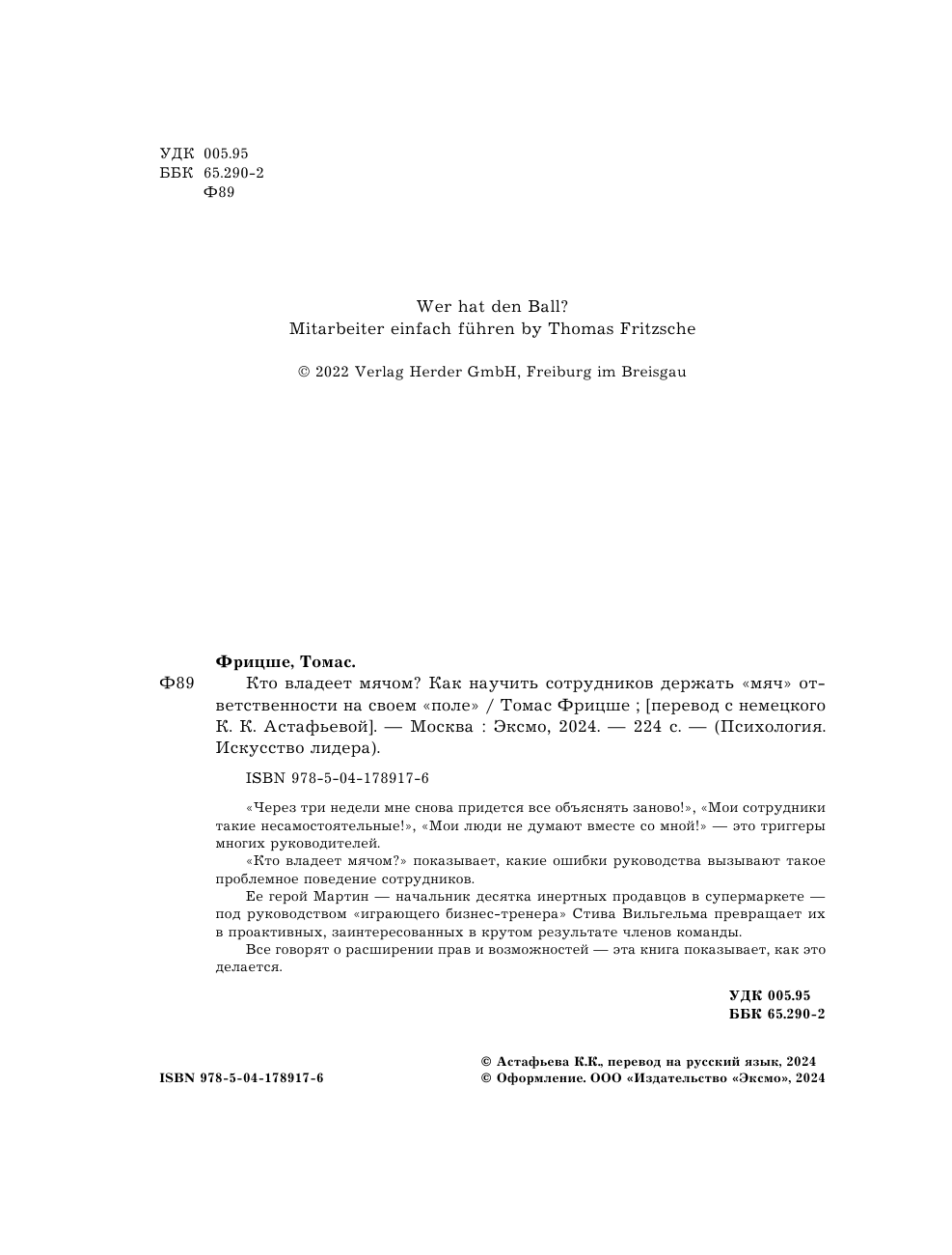 Кто владеет мячом? Как научить сотрудников держать «мяч» ответственности на своем «поле» (Фрицше Томас); ООО "Издательство "Эксмо", 2023