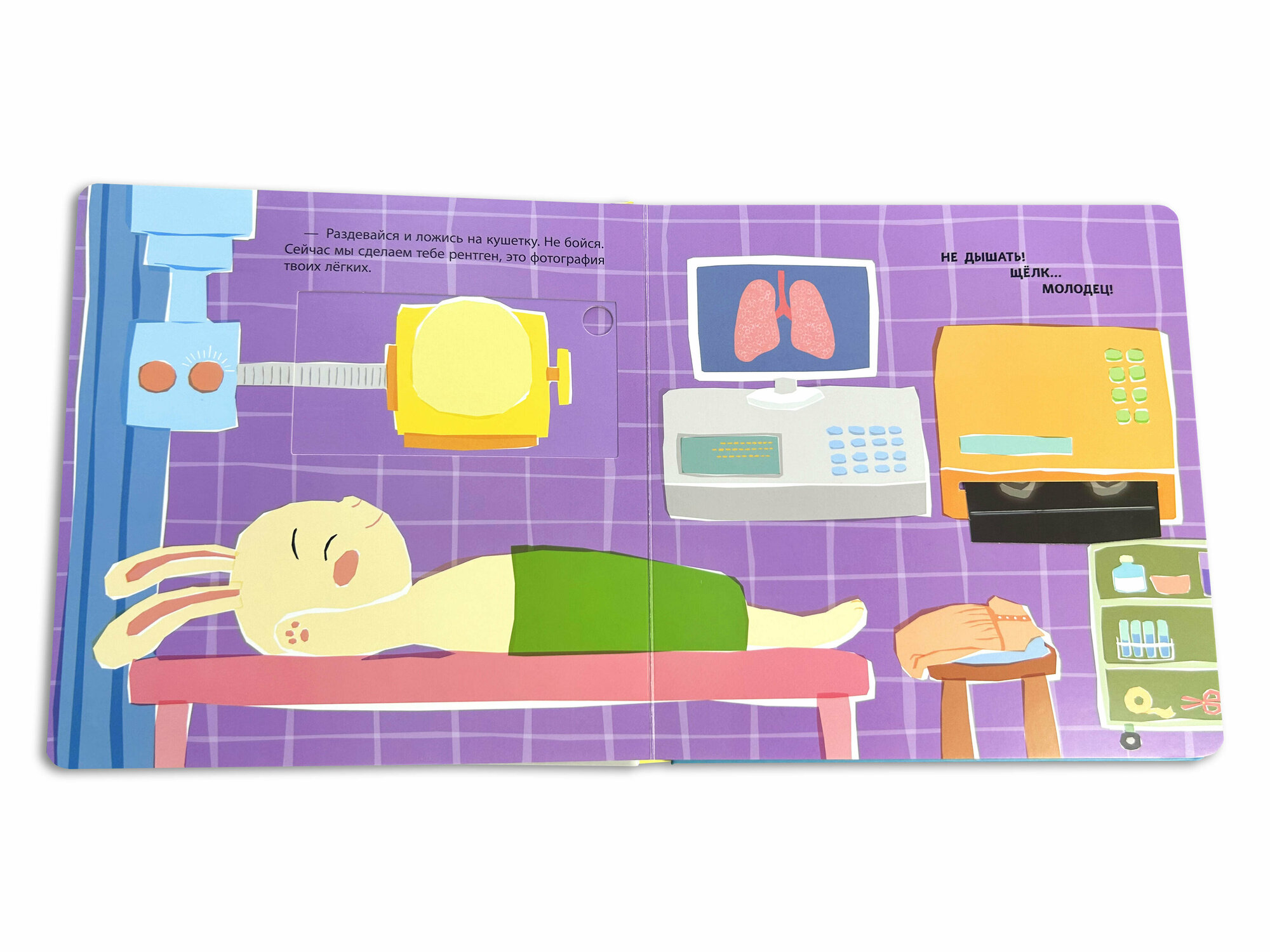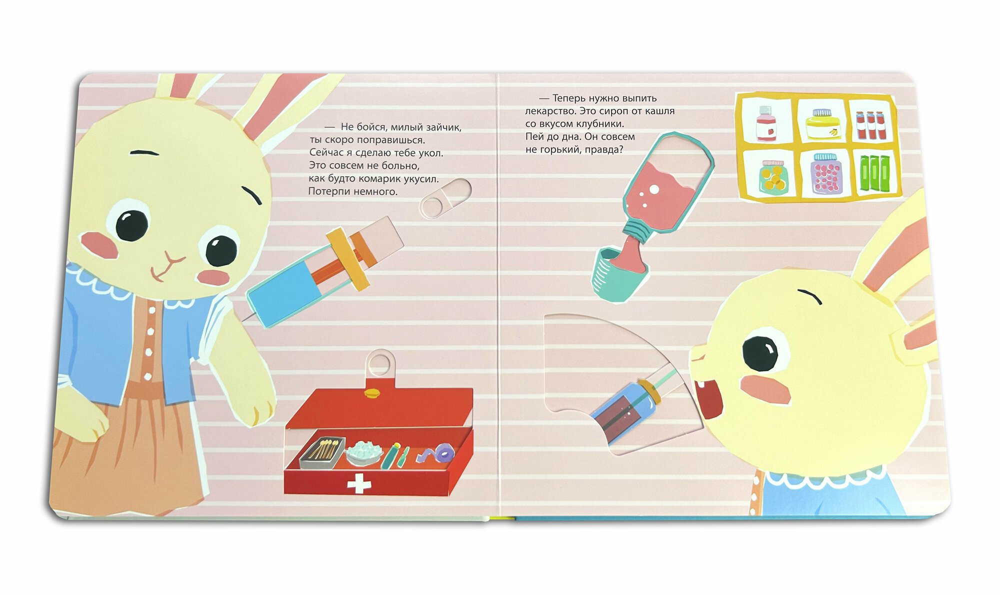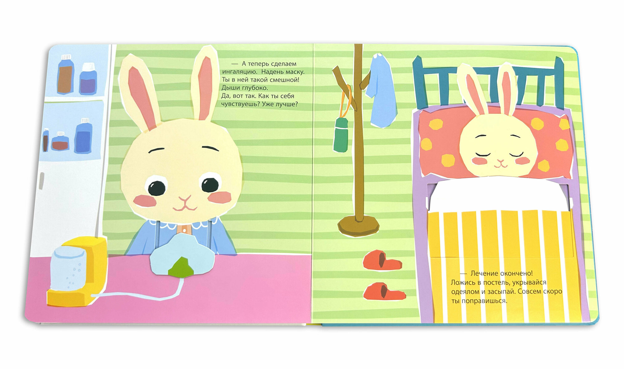 Маленький зайчик заболел. Измерь ему температуру, сделай укол, рентген и ингаляцию, напои лекарством и уложи малыша спать. Все необходимые процедуры ты сможешь выполнить прямо в этой книжке, благодаря подвижным элементам!